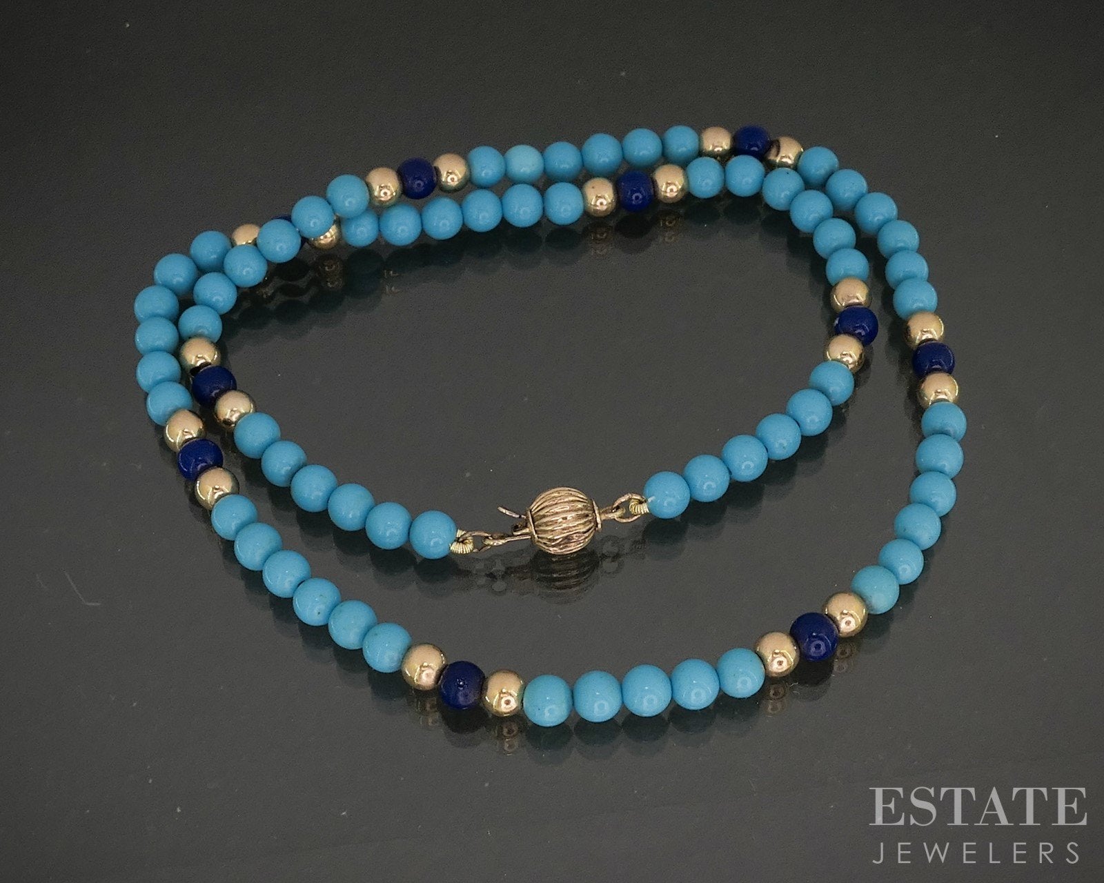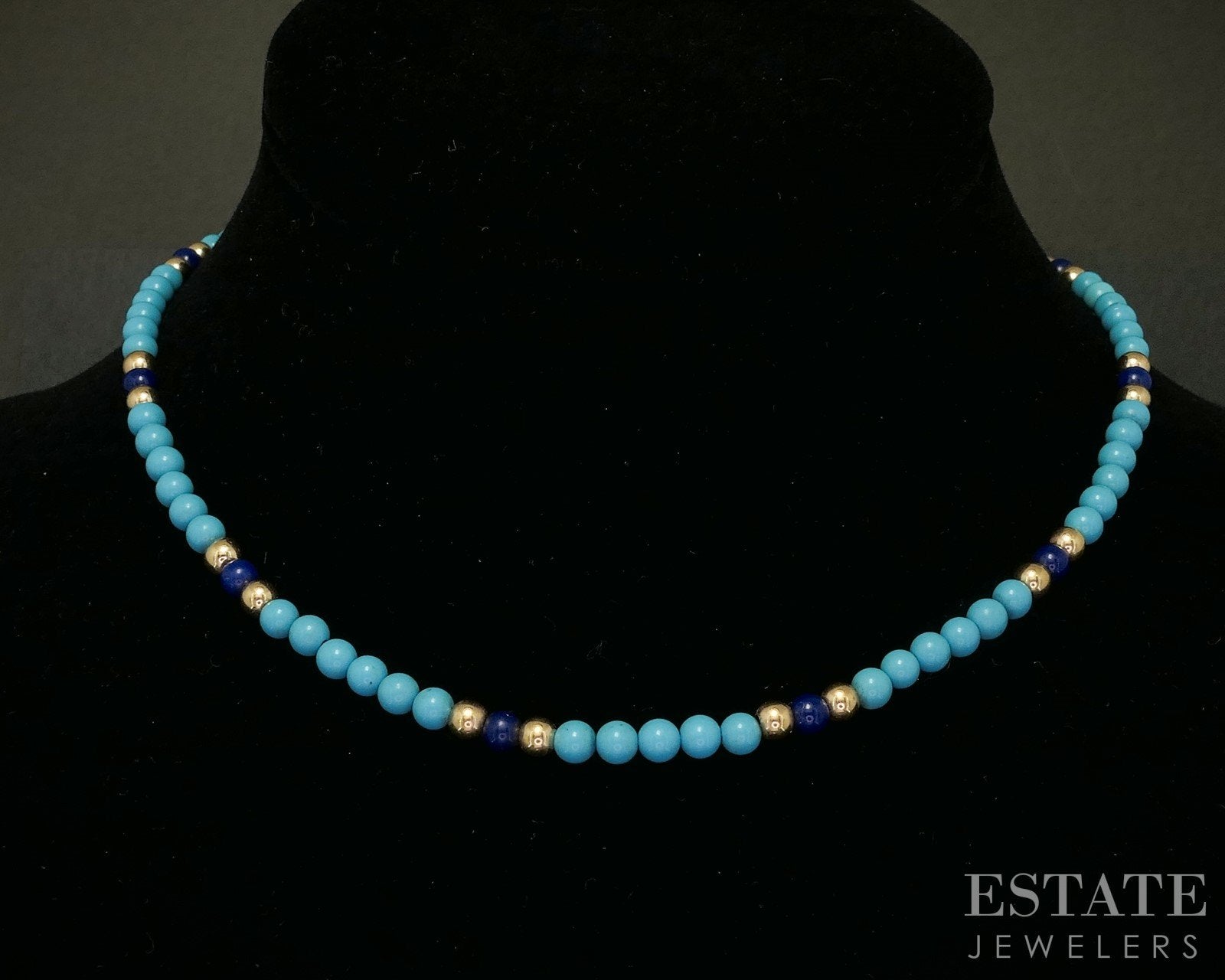 Additional Info: Beautiful ladies necklace with natural Turquoise and Lapis beads strung together and gold beads as spacers!