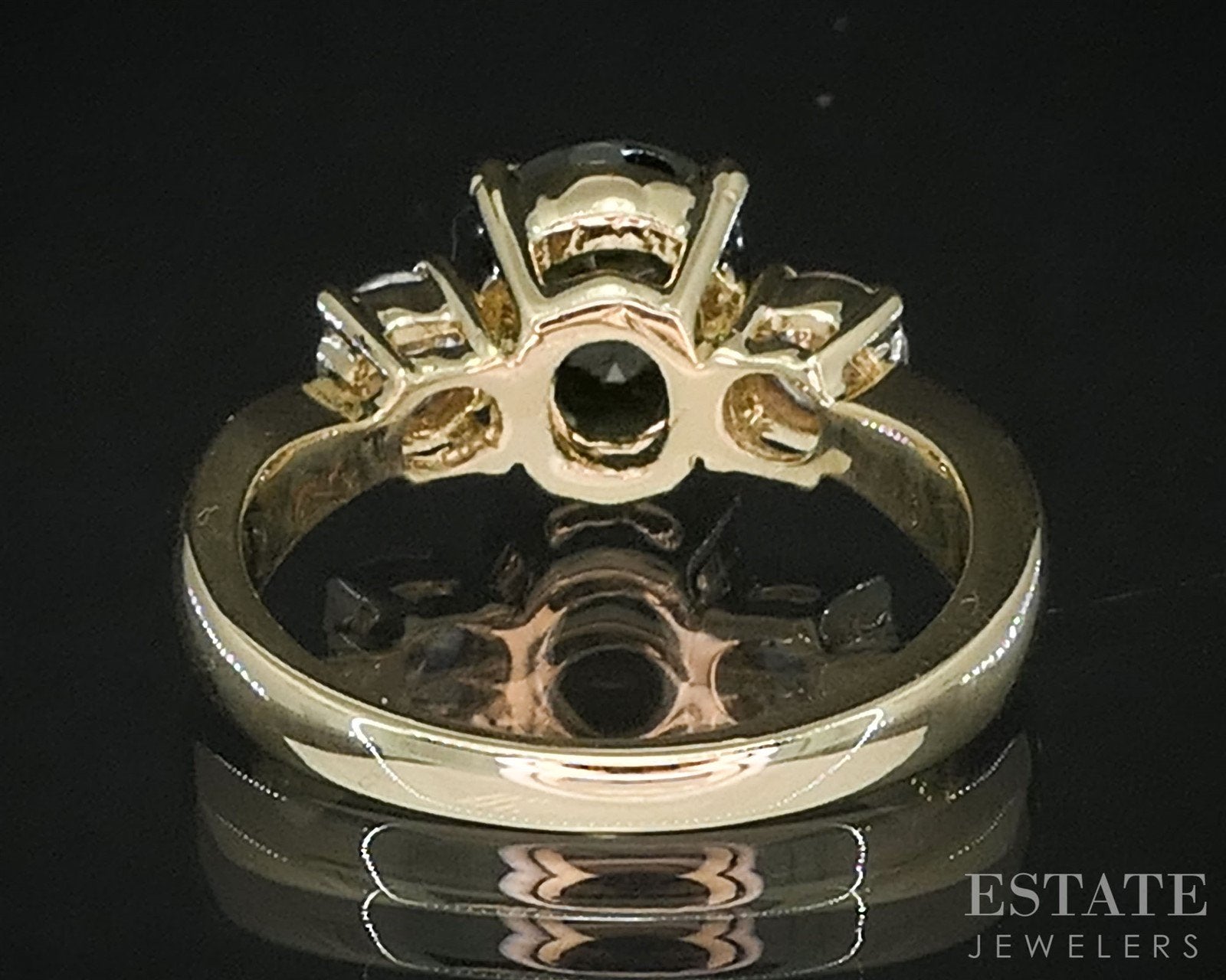 Additional Info: Make a bold and elegant statement with this captivating Green Sapphire and Diamond ring, set in rich yellow gold. At the heart of the design is a mesmerizing natural Sapphire in a rare green hue, prized for its depth, uniqueness, and enchanting color play. The sapphire is beautifully accented by two brilliant white Diamonds, adding a luxurious sparkle that enhances the center stone’s vibrant tones. The contrast between the warm glow of yellow gold and the cool, oceanic tones of the Sapphire creates a striking balance of color and elegance. Perfect for those who appreciate distinctive gemstones and timeless craftsmanship, this ring makes a stunning choice for an engagement, anniversary, or a meaningful personal piece. Bold, refined, and unforgettable—this is a ring that truly stands out.