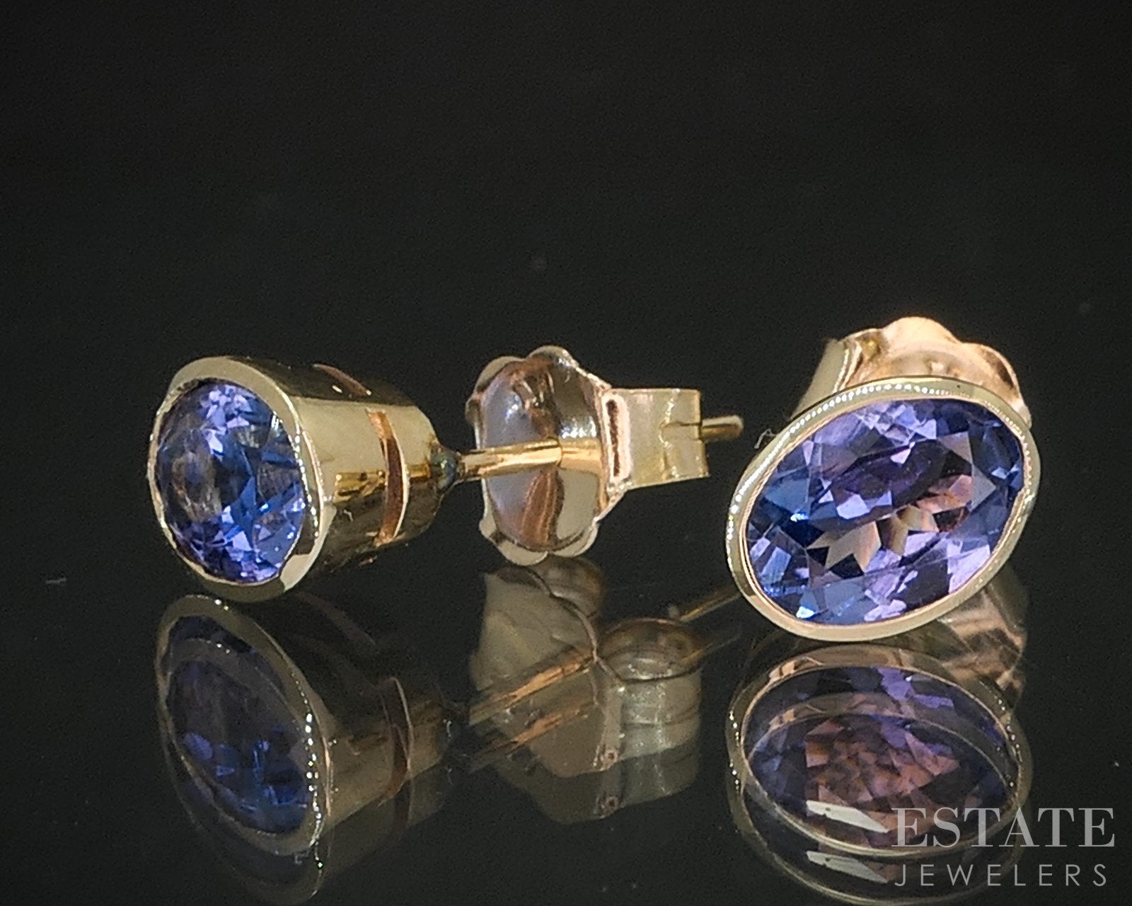 Additional Info: Lovely ladies stud earrings with vivid Tanzanite gems bezel set on the front.
