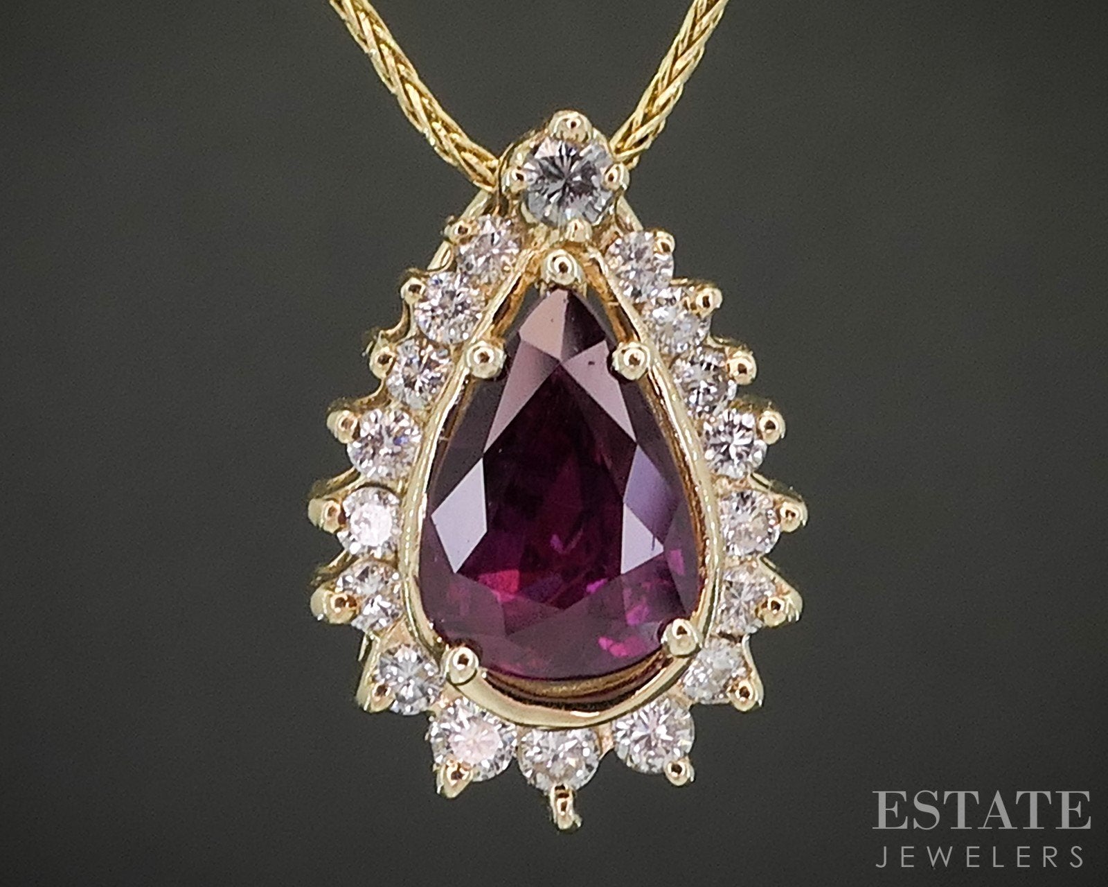 Additional Info: Crafted in warm, radiant yellow gold, this elegant necklace showcases a striking pear-cut natural Ruby, celebrated for its rich red hue and timeless allure. The ruby is gracefully framed by a shimmering halo of bright white Diamonds, each one carefully set to enhance the gemstone’s vivid color and eye-catching brilliance. Suspended from a delicate gold chain, the pendant offers a perfect balance of sophistication and warmth—an exquisite piece that brings classic luxury to any jewelry collection