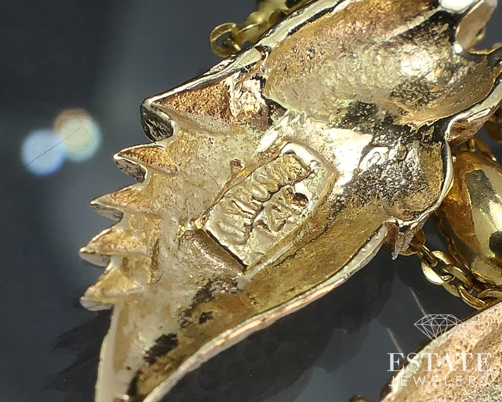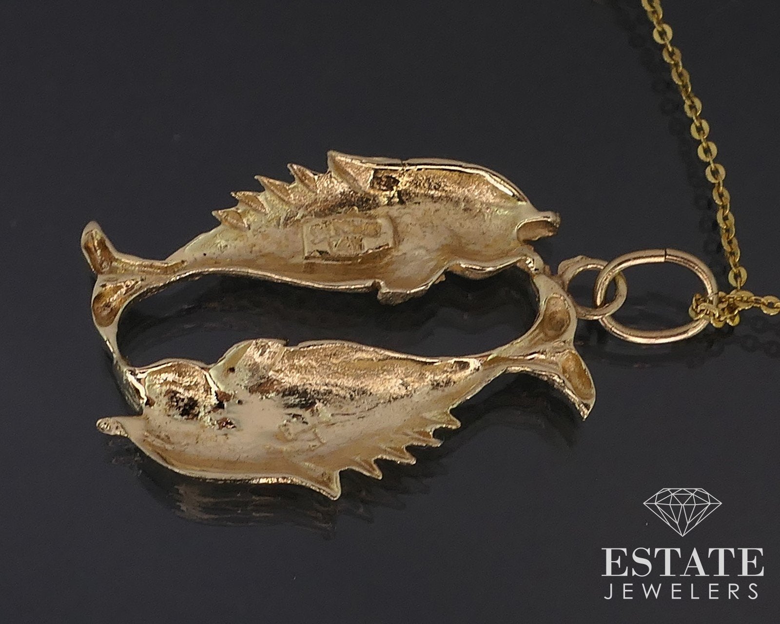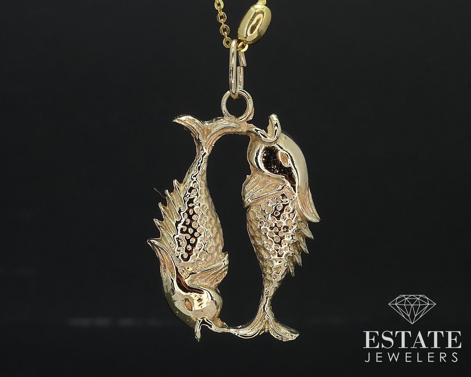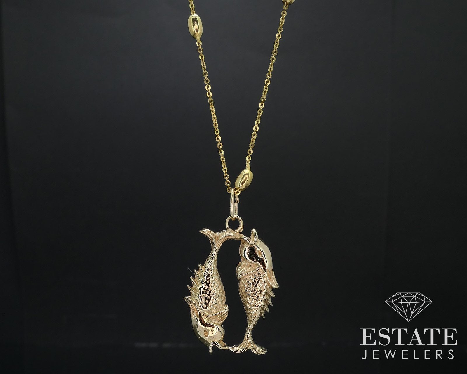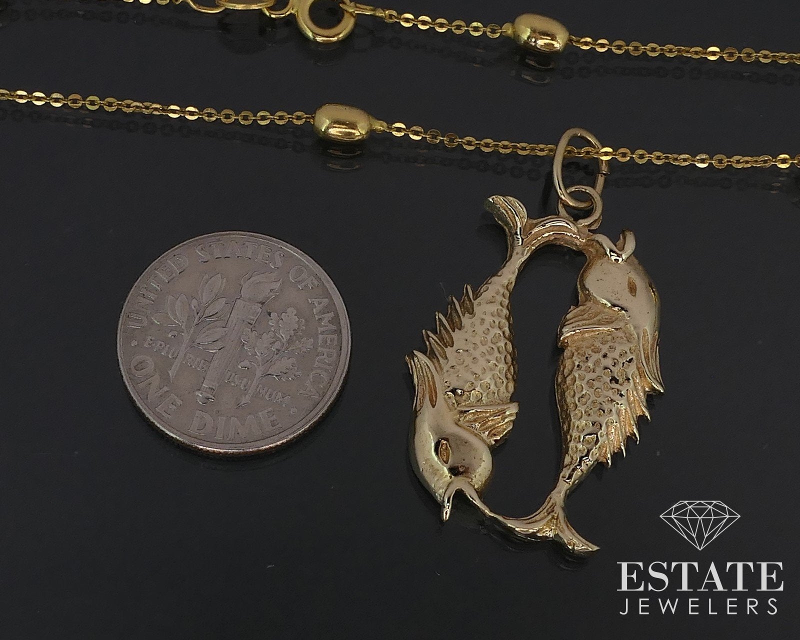 Lovely charm pendant shaped like the Zodiac Pisces fish. Attached to a 18"L beaded station style cable chain. 1-5/16"L pendant including bale. stamped 14k