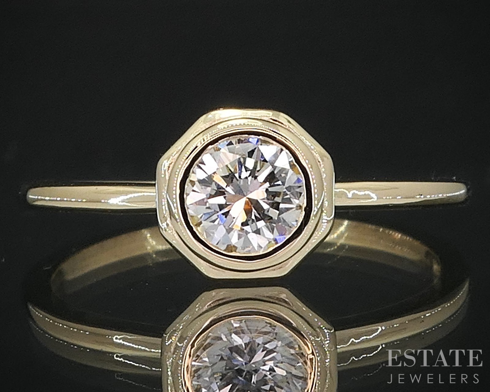 Additional Info: Modern elegance meets timeless simplicity in this yellow gold bezel set Diamond solitaire. A brilliant round Diamond is securely encased in a smooth, hexagon shaped bezel setting, offering a sleek, contemporary look while maximizing the stone’s natural radiance. The warm hue of the yellow gold contrasts beautifully with the Diamond’s sparkle, creating a piece that feels both refined and effortlessly wearable. With its clean lines and low profile design, this ring is perfect for everyday luxury or a minimalist engagement style.