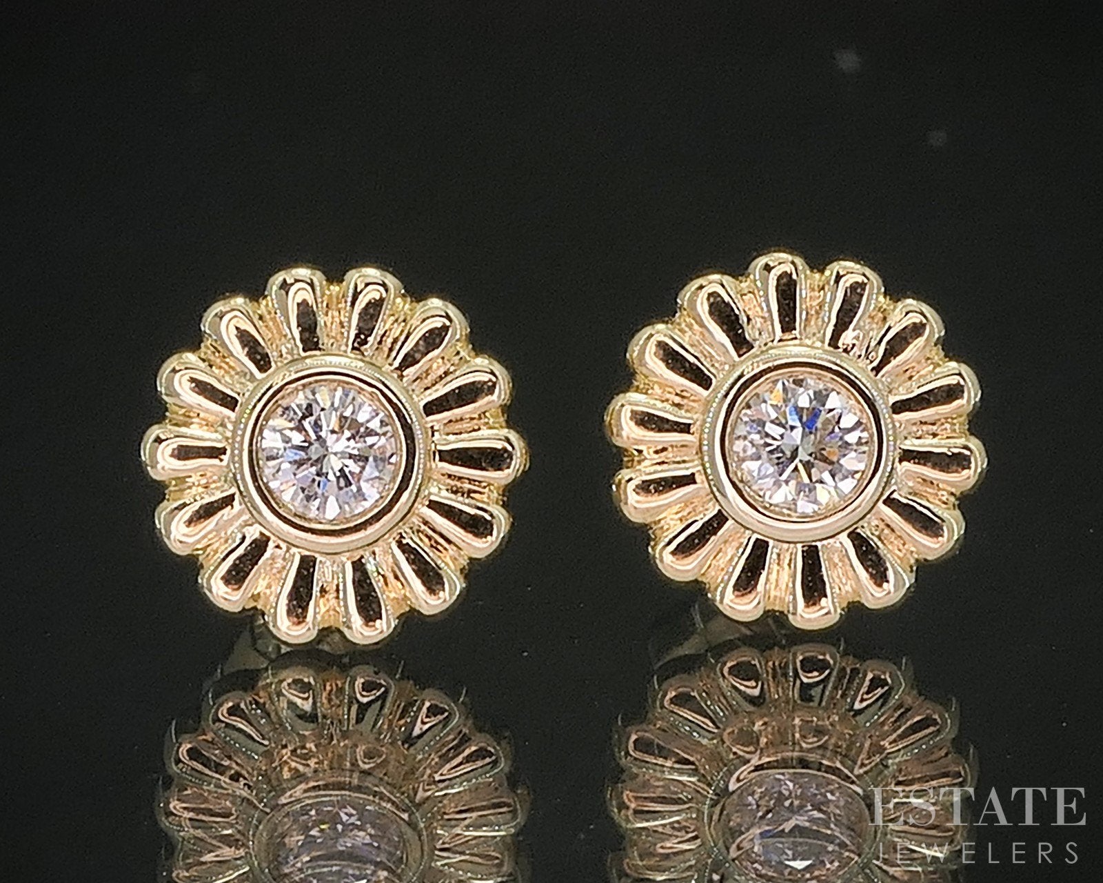 Additional Info: Sparkling ladies studs with round cut Diamonds bezel set in flower shaped settings!