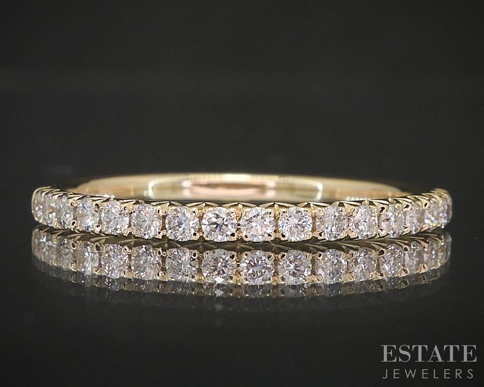 Additional Info: Timeless and refined, this yellow gold wedding band is a beautiful symbol of enduring love. Crafted in gold, the band features a row of sparkling round-cut Diamonds set securely in a sleek shared prong setting. The clean lines of the design highlight the brilliance of the Diamonds while offering a smooth, comfortable fit, perfect for everyday wear. Elegant on its own or paired with an engagement ring, this band blends classic style with lasting sophistication. 1.8mm wide