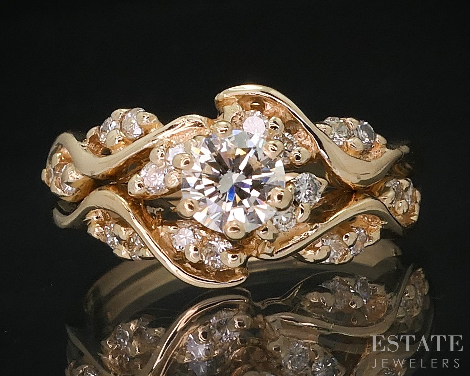Additional Info: Sparkling leafy style free form engagement ring with round cut Diamonds set in the middle and a matching wedding band.