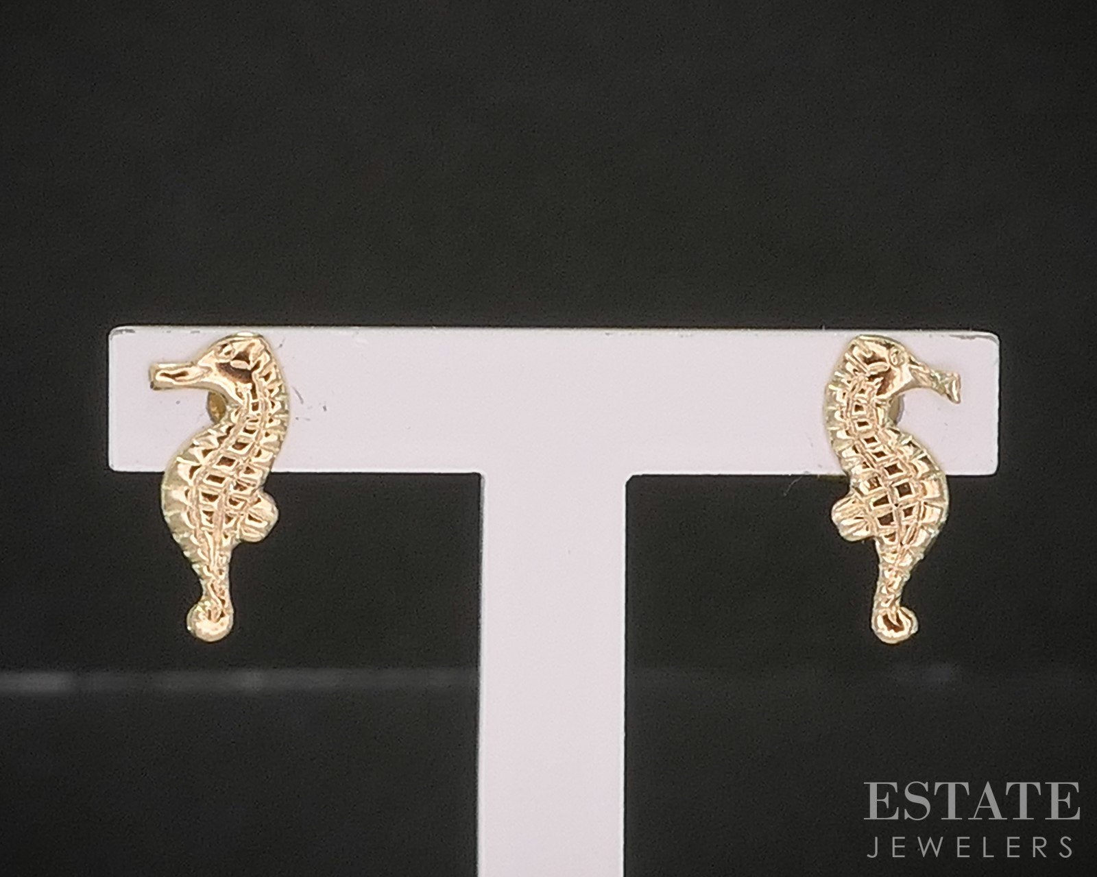 Additional Info: Dainty yellow gold stud earrings in the shape of a seahorse!