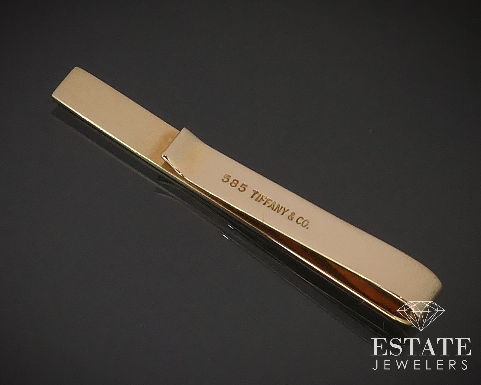 Genuine men's tie bar with the classic Tiffany smooth finish on the front. Stamped Tiffany & Co. 585 . 1-3/4"L and 3/16"W