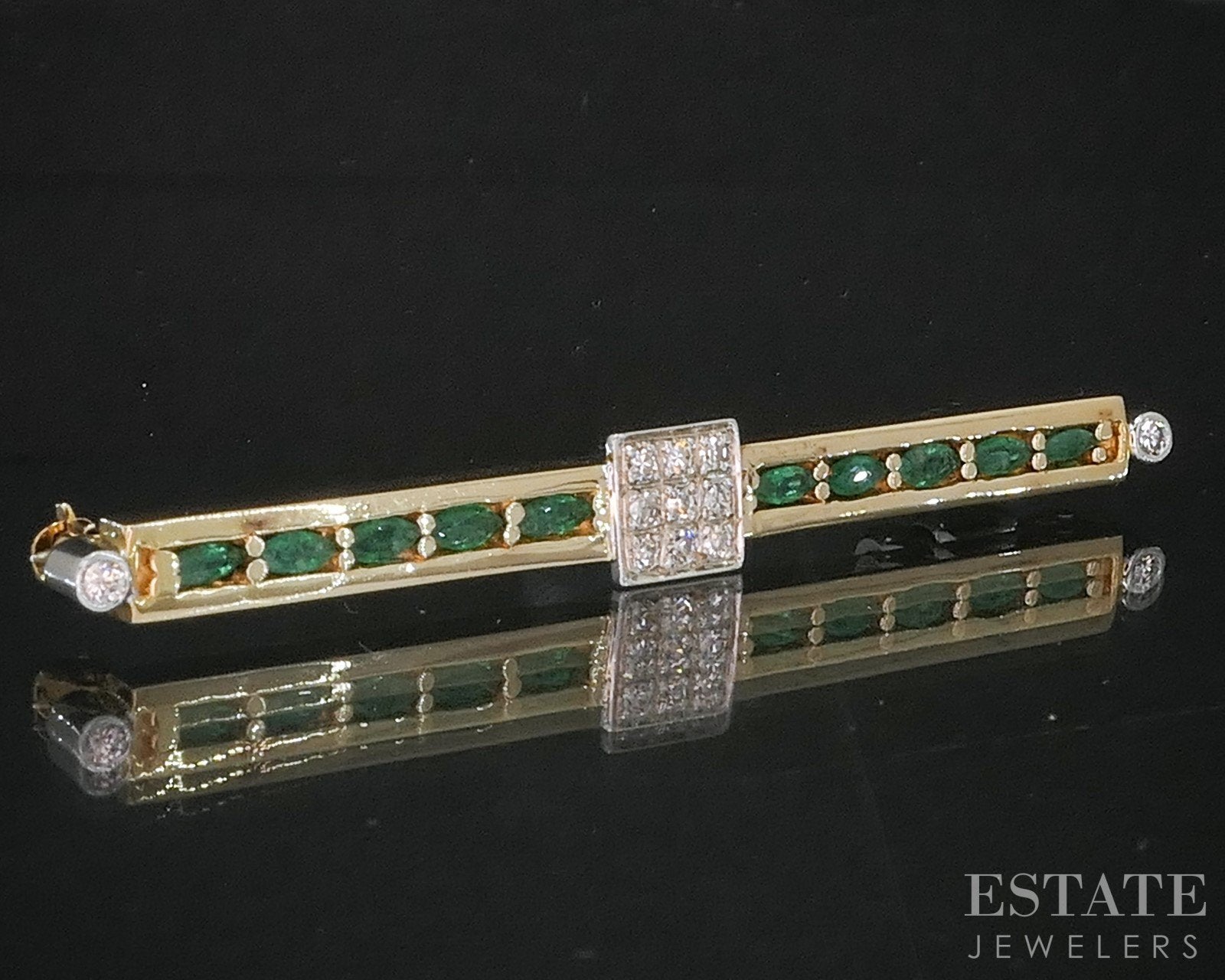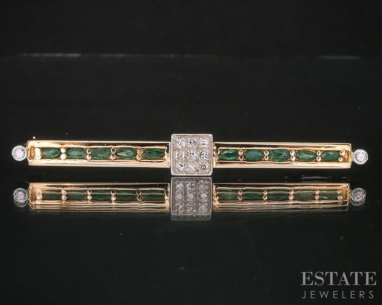 14k Yellow & White Gold Natural Emerald & Diamond Bar Pin Brooch 9.7g i20160