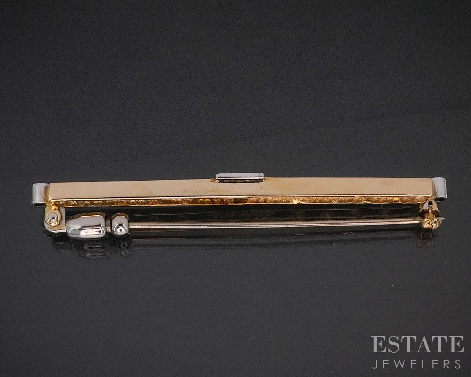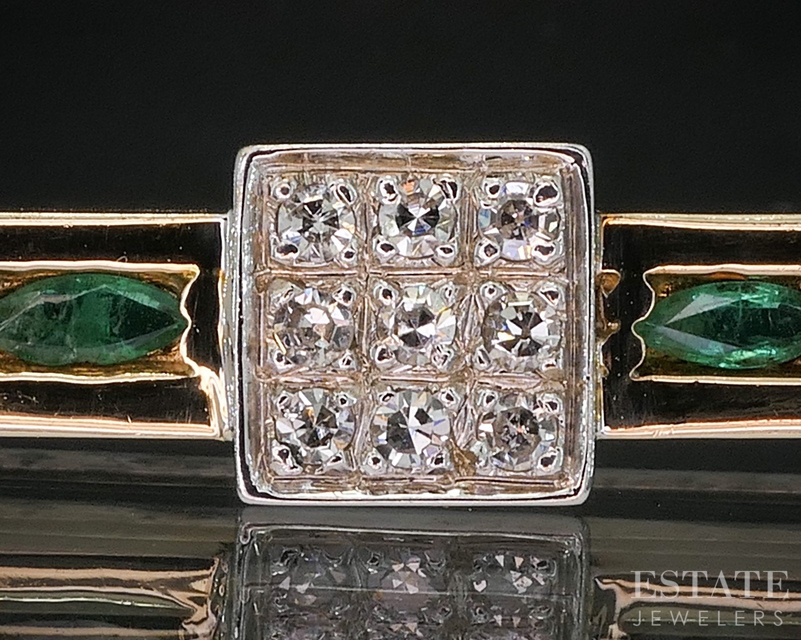 Additional Info: A beautiful blend of classic elegance and timeless craftsmanship, this vintage bar pin brooch showcases a harmonious mix of yellow and white gold. At its center rests a row of vivid emerald-cut Emeralds, prized for its rich green hue and striking clarity. Pave' set in the middle are glittering accent Diamonds, set in white gold to enhance their brilliance and provide a dazzling contrast. The bar design, sleek yet ornate, embodies vintage sophistication—perfect as a collector’s piece or as a statement accessory on lapels, scarves, or dresses. This brooch captures the enduring charm of fine jewelry artistry from a bygone era.