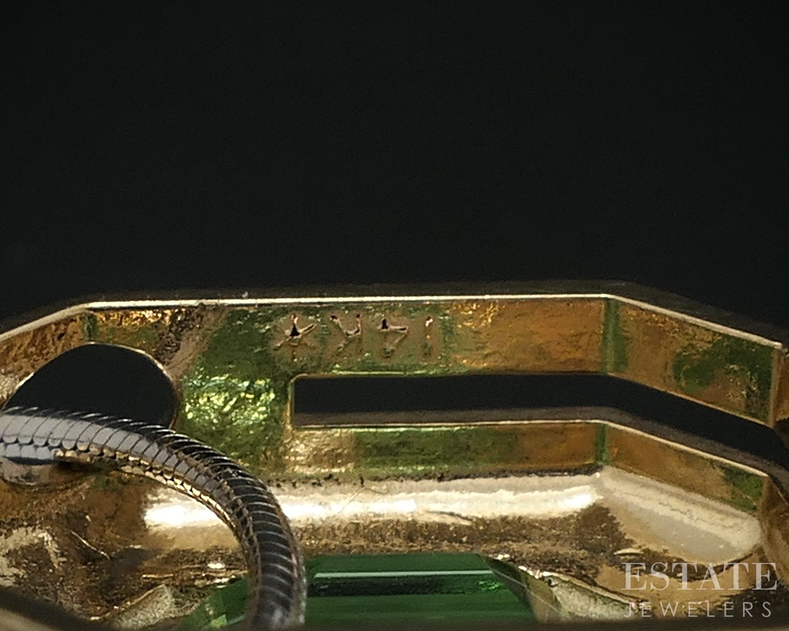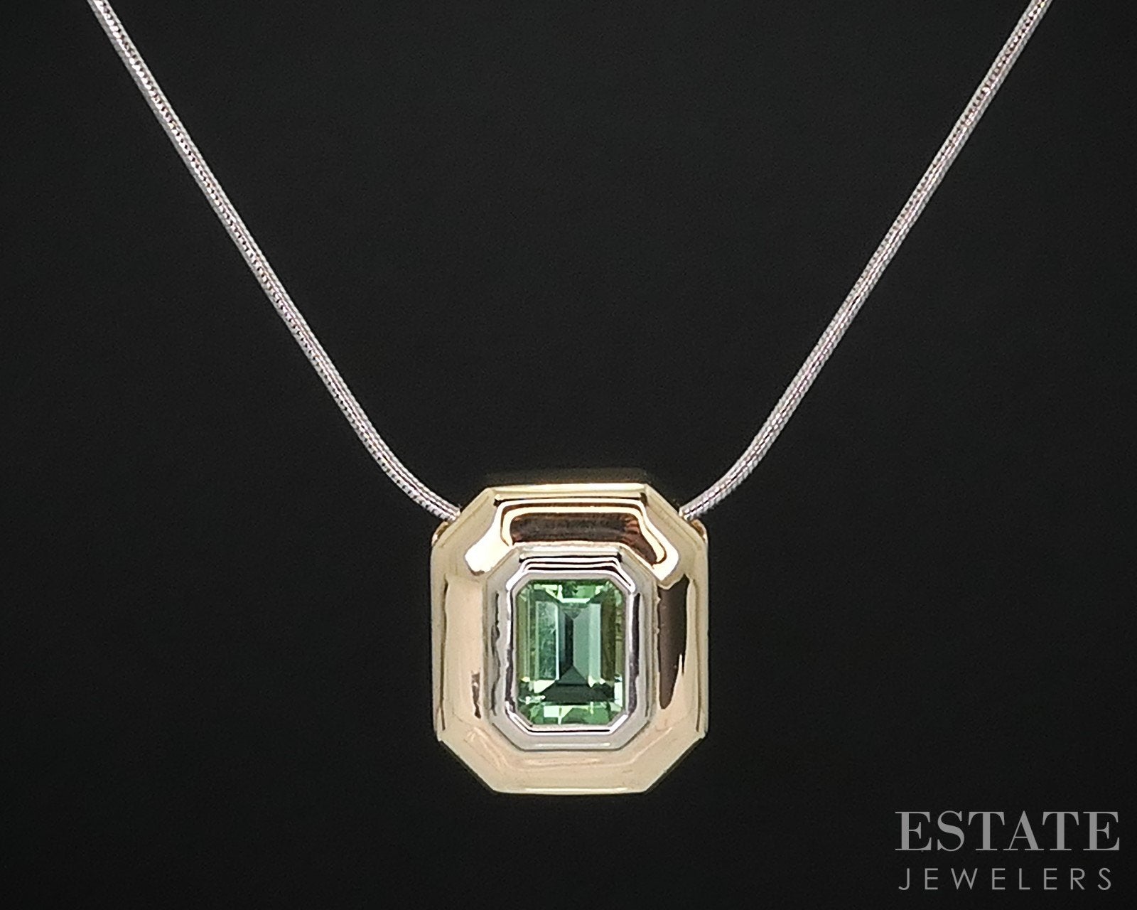 Additional Info: Vivid Prasiolite gem bezel set in a two tone slide pendant. Attached to a white gold snake chain.