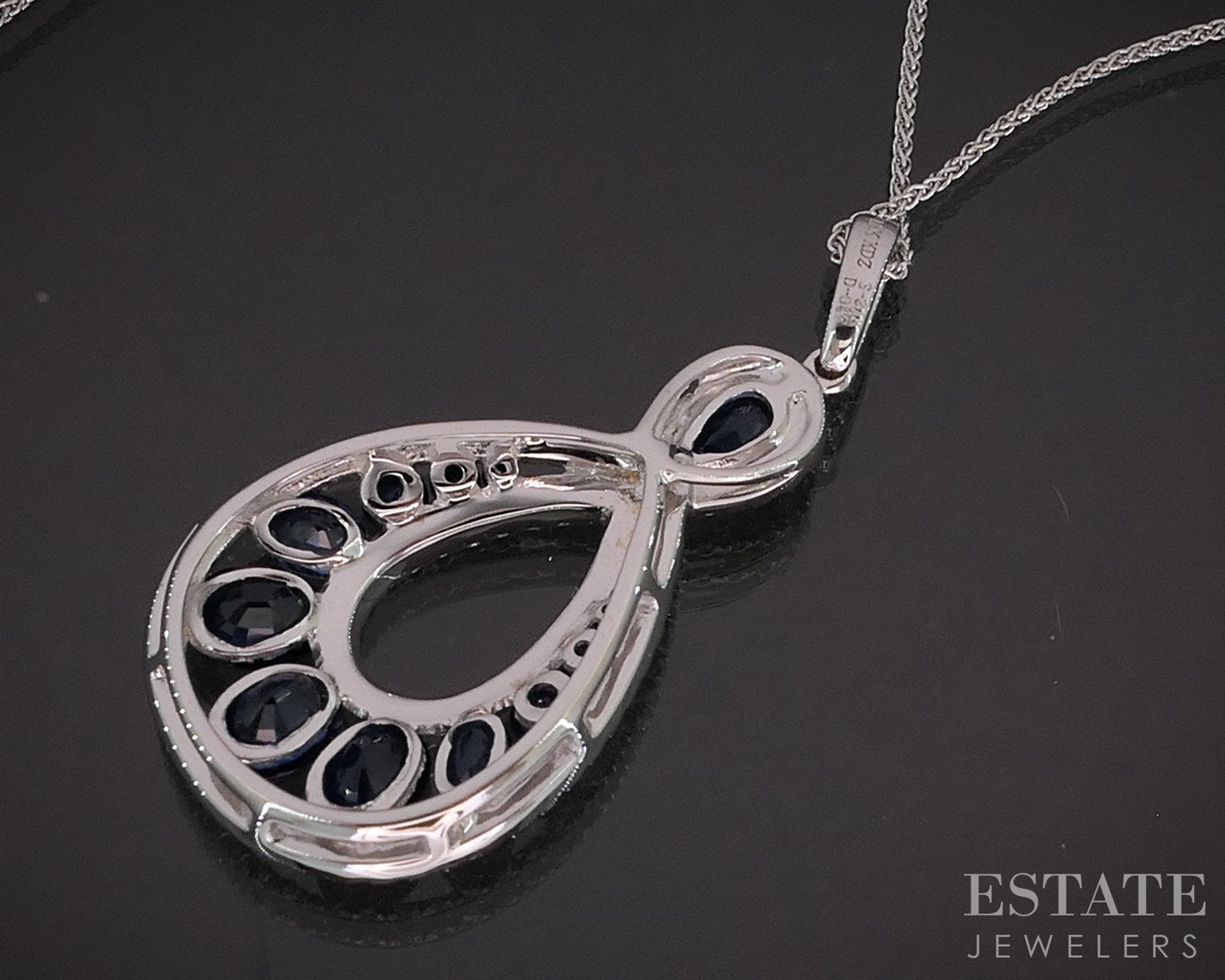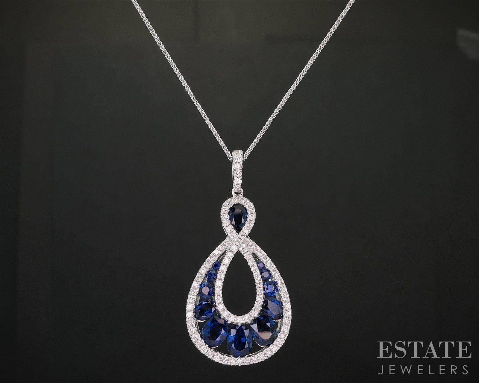 Additional Info: Striking and sculptural, this 18k white gold pendant is a true expression of modern elegance. Designed in an organic teardrop shape, echoing natural curves with an artistic edge. Brilliant-cut Diamonds are thoughtfully set to accentuate the fluidity of the piece, adding a luminous contrast to the rich, velvety blue of the carefully selected Sapphires. Bold yet refined, this necklace is a contemporary masterpiece. Perfect for those who seek luxury with a unique, expressive twist.