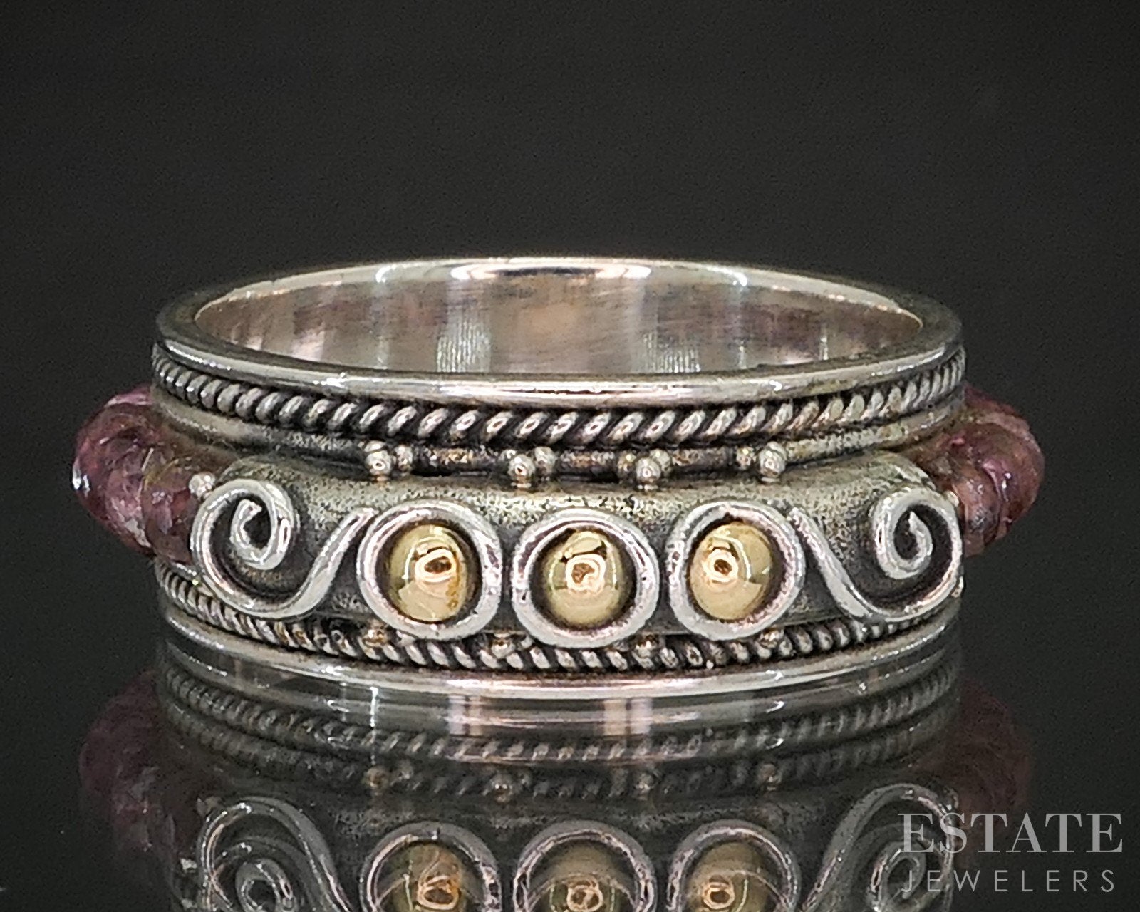Additional Info: Lovely Indonesian band with domed 18k gold domed sections and suarti silver designs accenting the natural Rhodolite Garnet beads.