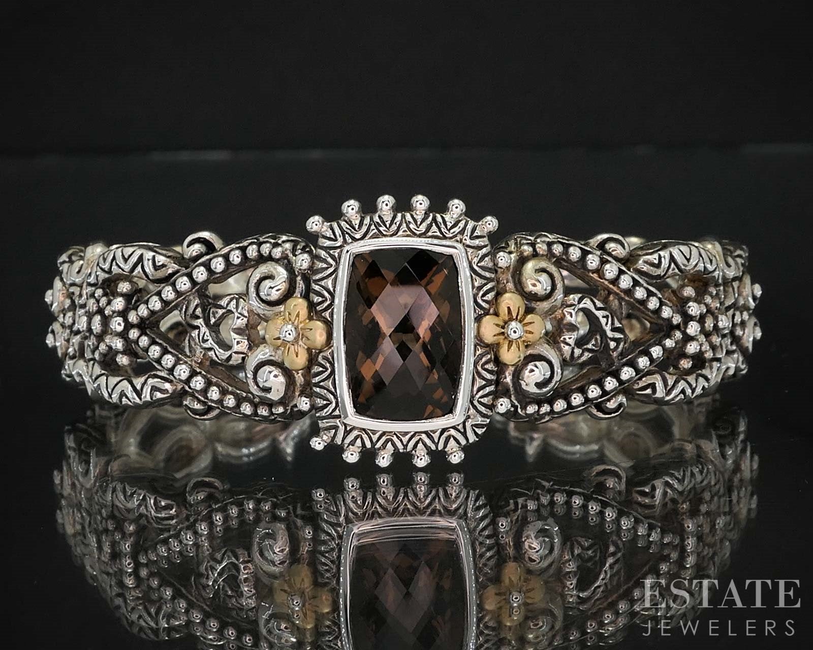 Additional Info: Genuine Barbara Bixby bracelet with a Smoky Quartz gem. Beautiful silver scroll and solid gold flower accents!