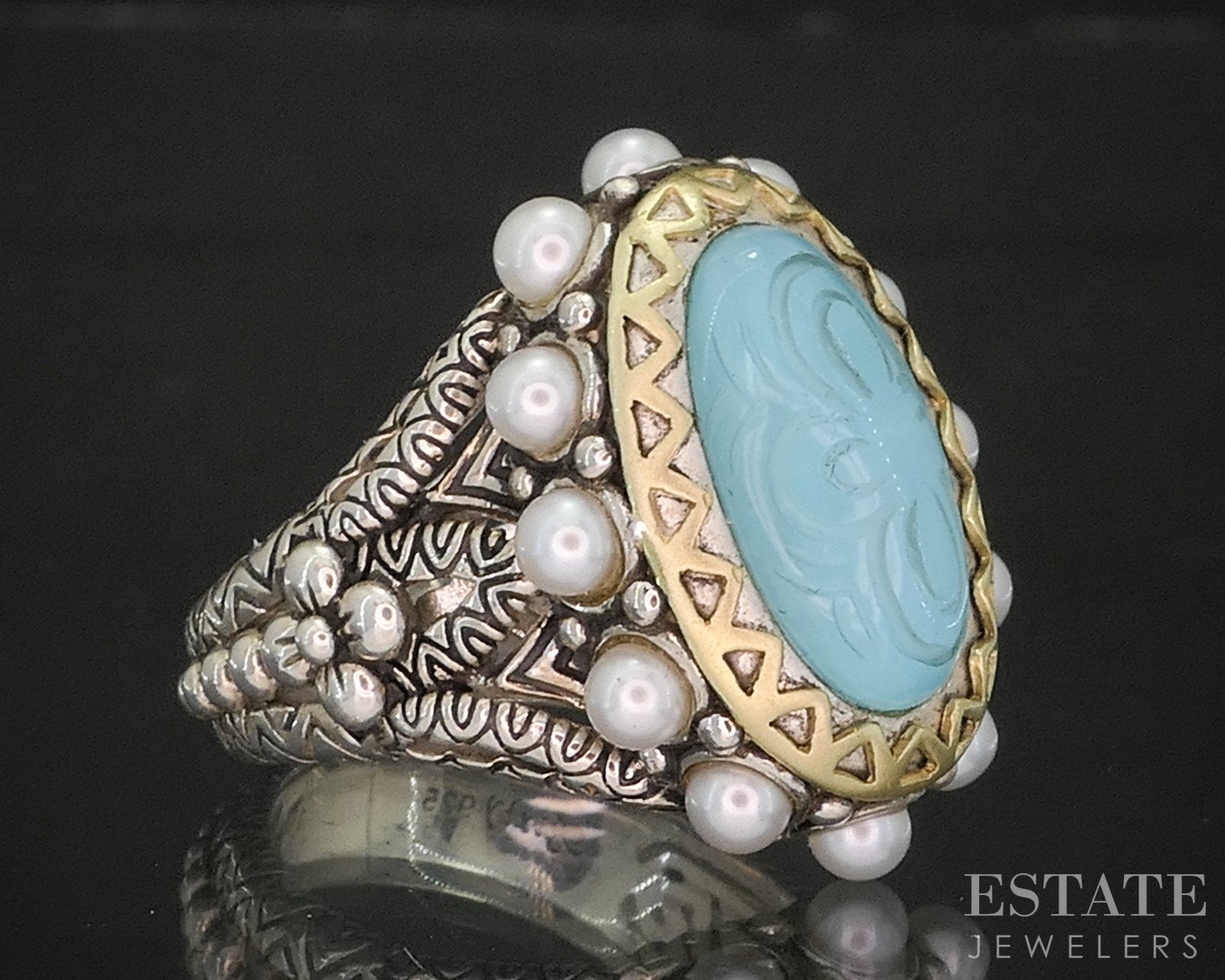 Additional Info: Genuine Barbara Bixby ring with a carved Turquoise doublet set in the middle of a Pearl covered solid gold bezel!
