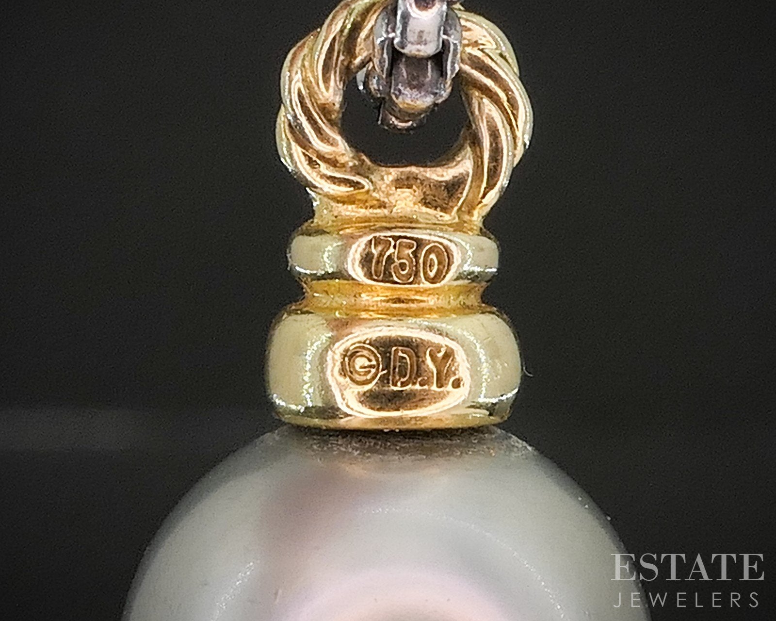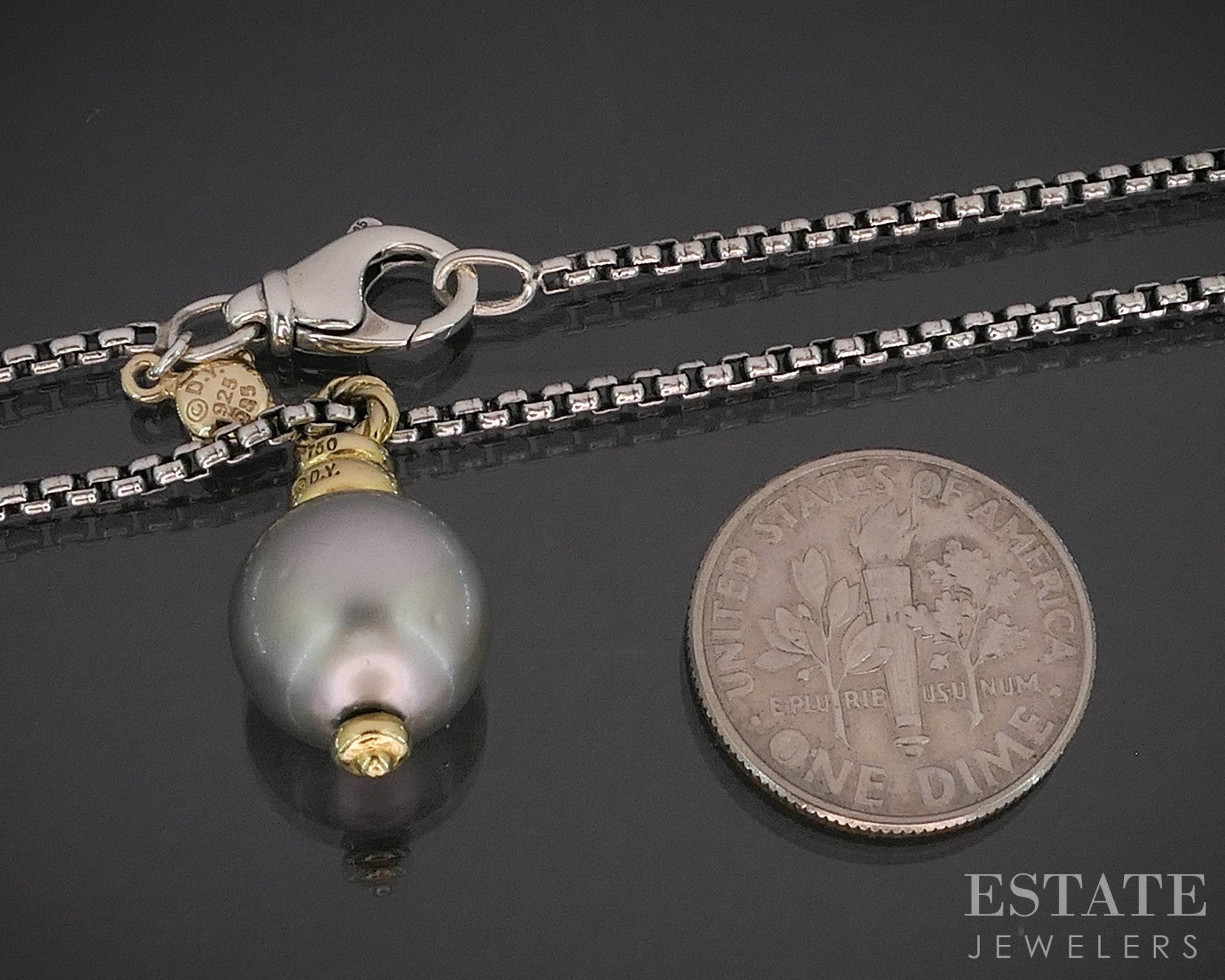 Additional Info: Lovely ladies David Yurman necklace with a 18k Grey Cultured Pearl pendant attached to the matching rounded box chain. 14k DY charm attached on the clasp. Original retail a whopping $700!