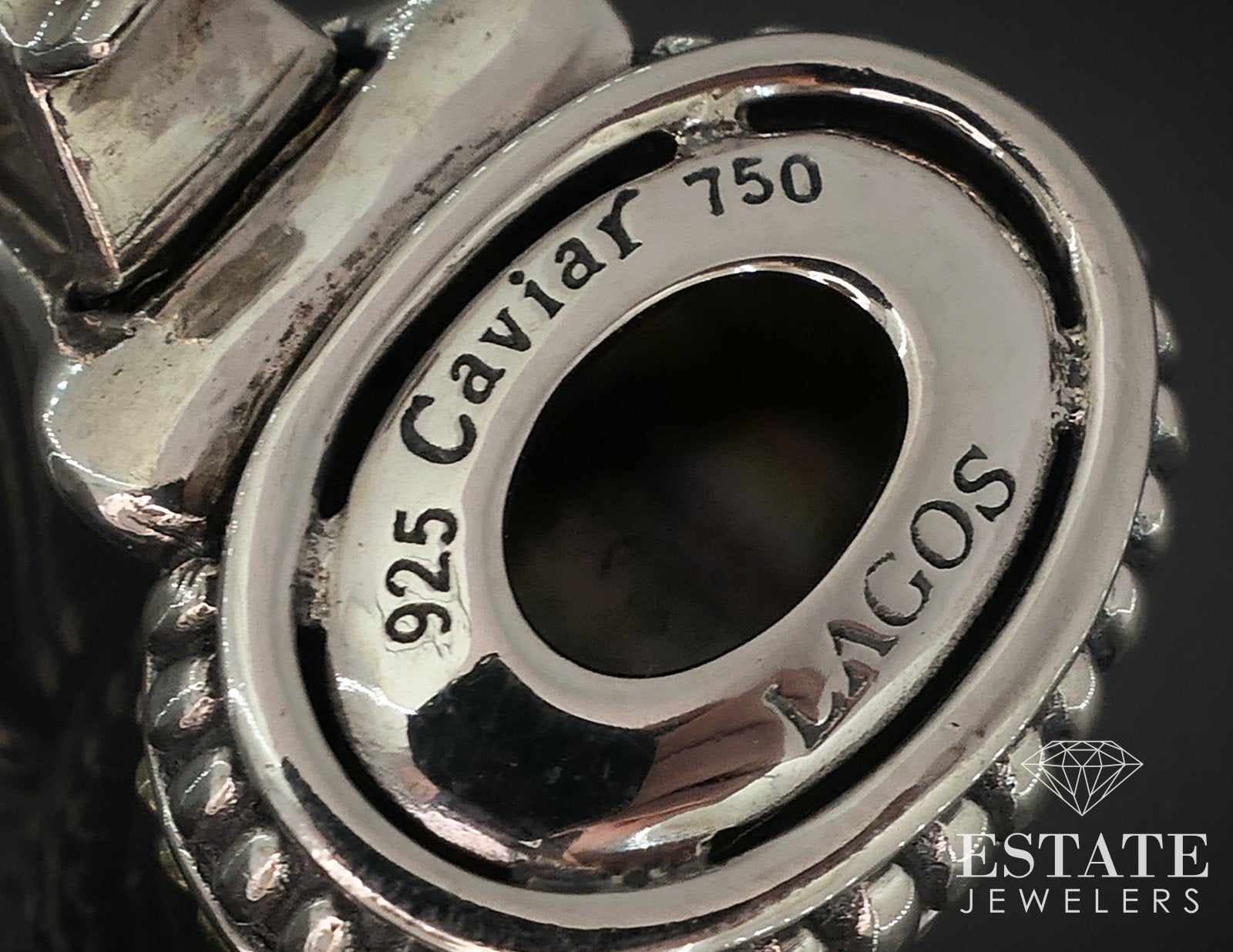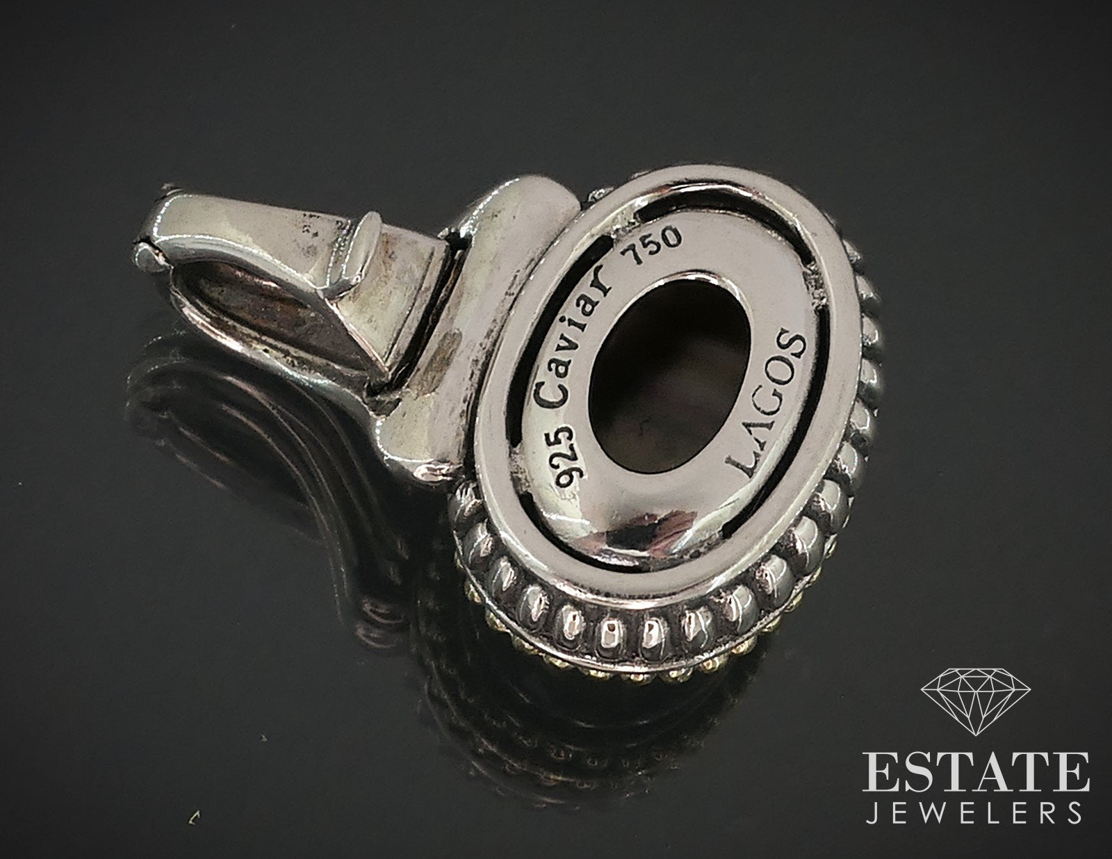 Beautiful Lagos sterling enhancer pendant with classic 18k gold Caviar designs around the stone. 15mm by 10mm faceted quartz and abalone doublet! Really unique stone pairing. 1-1/8"L including bale. Stamped CAVIAR 925 750. Comes with original Lagos pouch