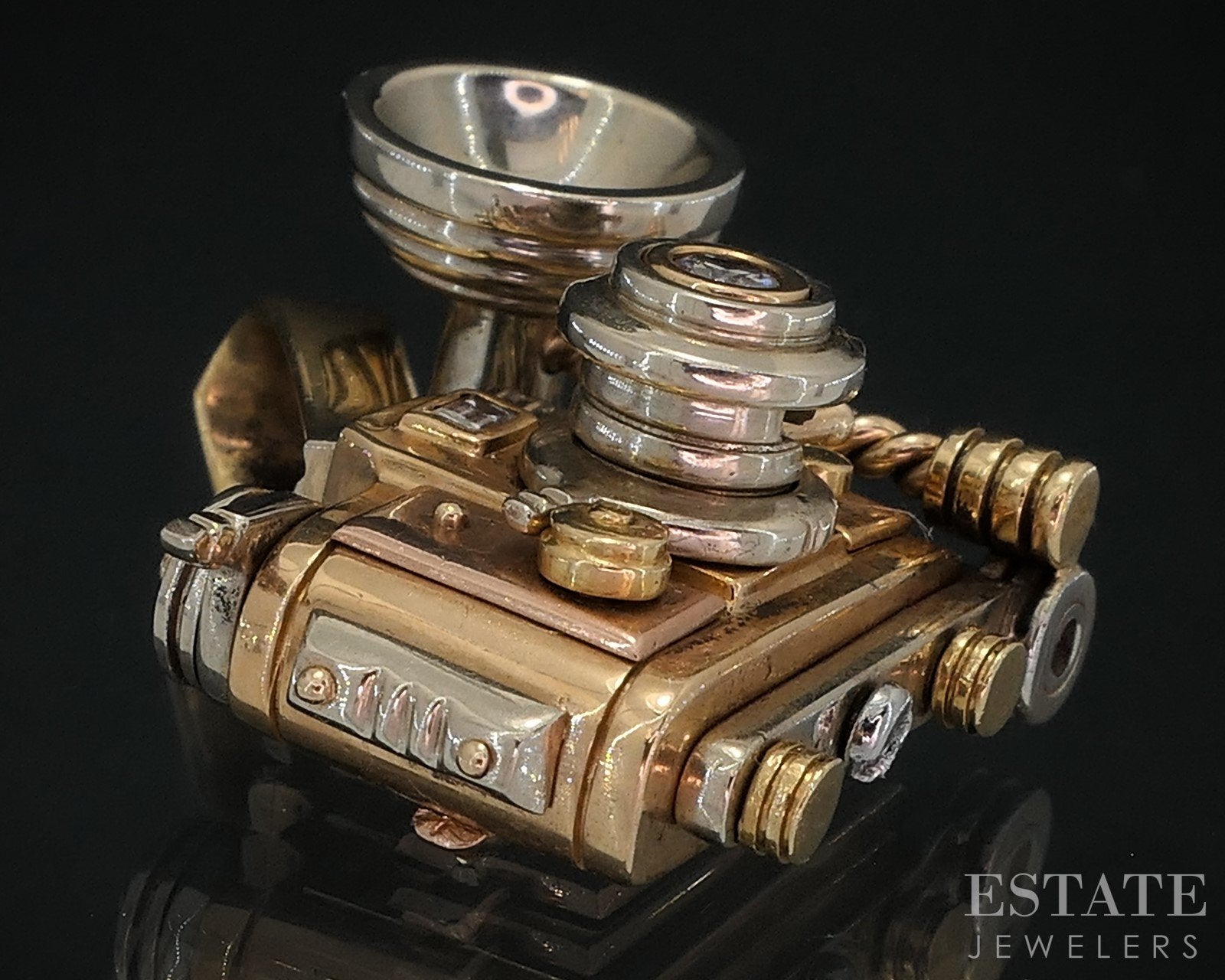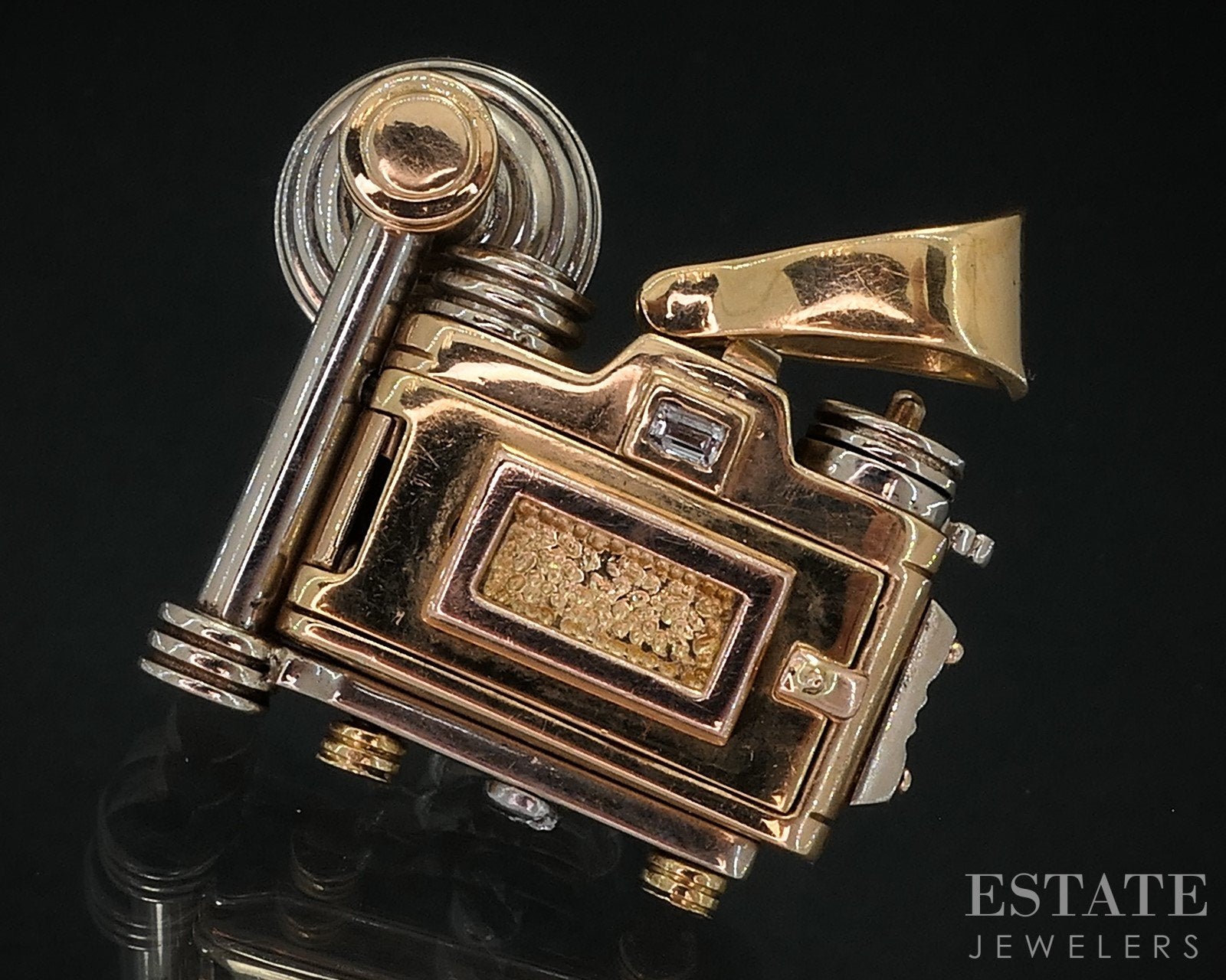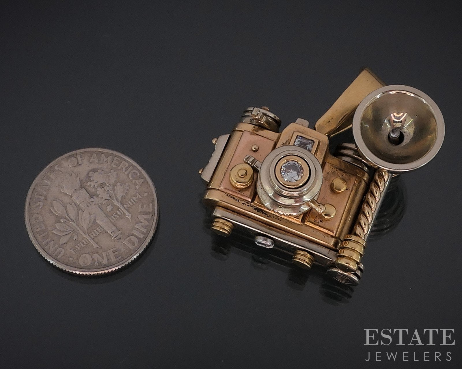 Additional Info: Stunning custom made charm shaped like a real vintage camera. Constructed of rose, yellow and white gold. Incredible detail to the piece with movable parts you would see on a old camera. Such as spinning aperture and f-stop settings, hinged film cover and spring loaded button! Sparkling Diamonds makes up the lens and eye hole! Extremely well made piece that's truly a work of art!