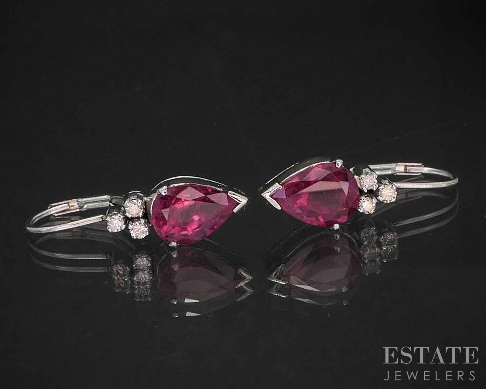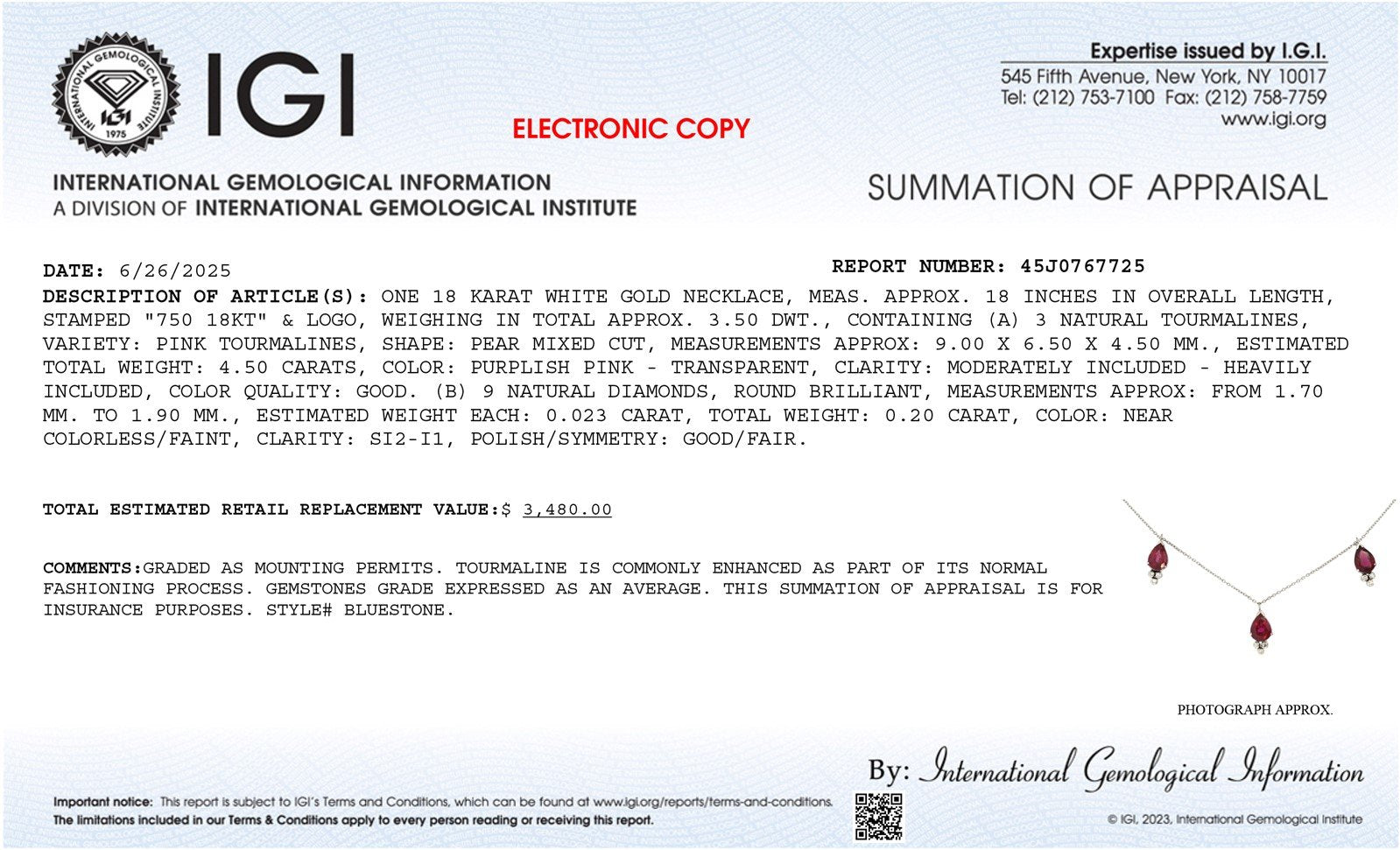 Additional Info: These exquisite 18K white gold lever-back earrings feature dazzling pear-cut Pink Tourmalines, each certified by IGI for their exceptional color and clarity. The vibrant pink gemstones are beautifully complemented by sparkling Diamond accents that trace the elegant drop design, enhancing their brilliance with every movement. The polished white gold setting provides a sleek, modern backdrop that highlights the gemstones’ vivid hue. Finished with secure lever-back closures, these earrings combine timeless sophistication with a touch of romantic allure — perfect for both everyday elegance and special occasions. Look for the matching necklace.
