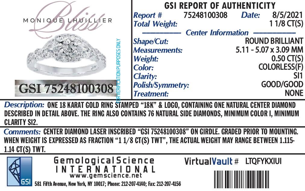 Sparkling ladies engagement ring and wedding band from Monique Lhuillier with approximately 1.32cw of diamonds and that's including the main GSI certified .50ct round diamond. SI1 clarity with F color. From the Bliss line at Kay Jewelers! stamped 18k Bliss Monique Lhuillier SIZE-6