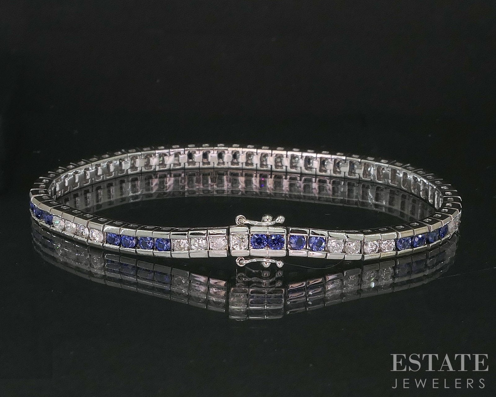 Additional Info: This exquisite 18k white gold tennis bracelet showcases a timeless harmony of elegance and color. A continuous line of vivid Blue Sapphires alternates with brilliant round Diamonds, each expertly set to maximize sparkle and contrast. The deep, velvety hue of the Sapphires is beautifully enhanced by the icy brilliance of the Diamonds, creating a refined rhythm of light and color along the wrist. Crafted in polished 18k white gold, this bracelet combines classic sophistication with modern luxury — a perfect statement of understated glamour for any occasion!