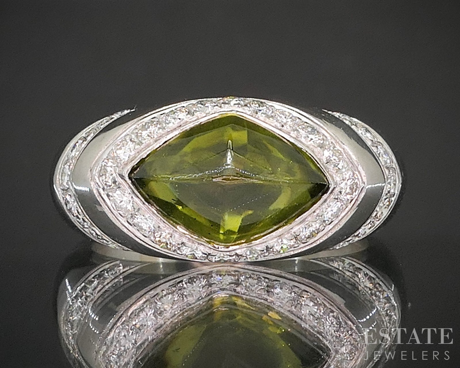 Additional Info: This striking ring is crafted in luminous white gold and showcases a captivating cabochon Green Tourmaline at its center. The smooth, domed surface of the gemstone reveals deep, verdant hues that shimmer with natural inner light. Surrounding the centerpiece, sparkling Diamonds accentuate the ring’s elegant curves, adding brilliance and contrast to the rich green tone. The polished white gold setting enhances the gem’s vivid color and modern sophistication, creating a piece that is both bold and timeless — a true statement of refined luxury.