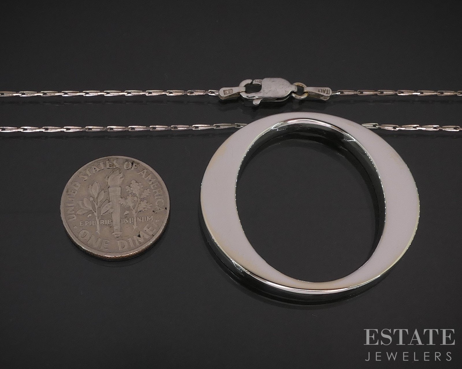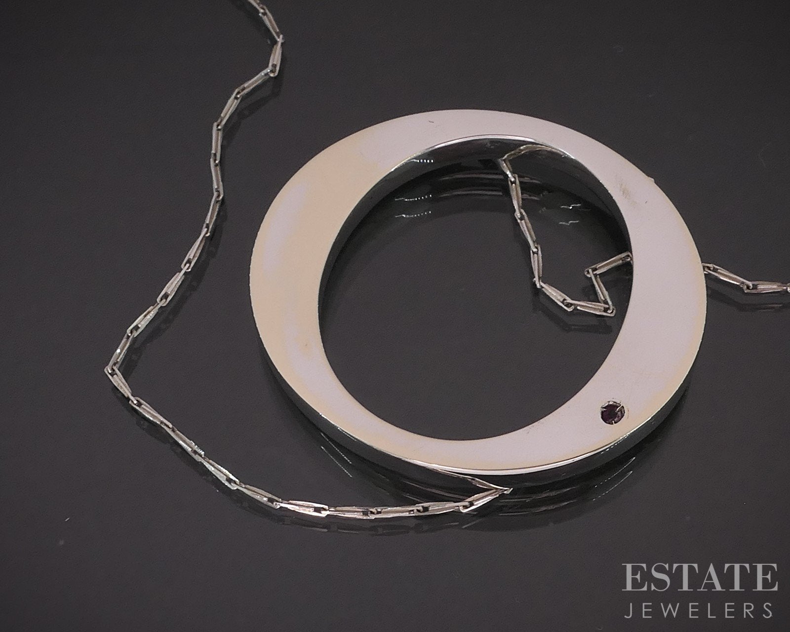 Additional Info: Sleek, modern, and effortlessly elegant, this Roberto Coin necklace features a polished “O” pendant crafted in luminous 18k white gold. Suspended from a delicate chain, the minimalist design showcases the brand’s signature attention to detail and timeless Italian craftsmanship. As with all Roberto Coin creations, a hidden ruby is embedded on the reverse. Symbolizing a wish for health, happiness, and good fortune. Perfect for layering or wearing solo, this piece adds a subtle statement of luxury and meaning to any look.