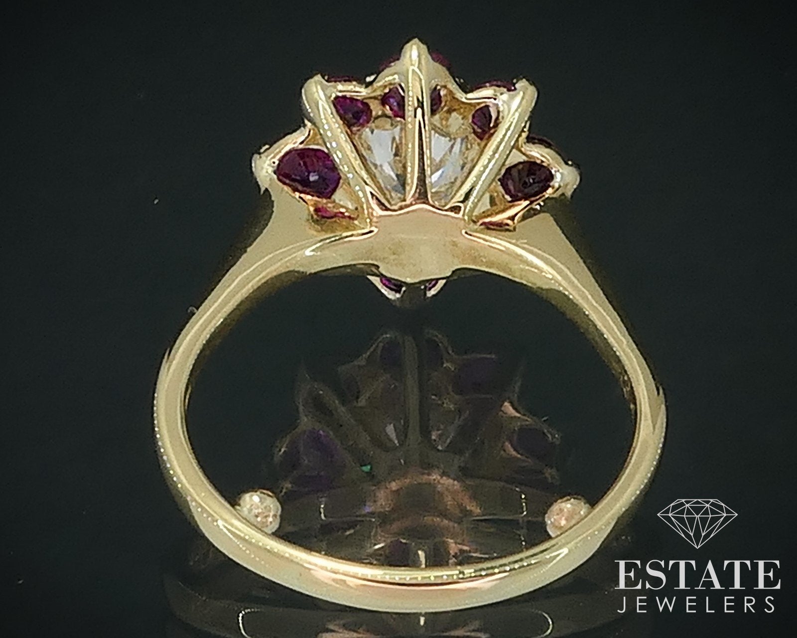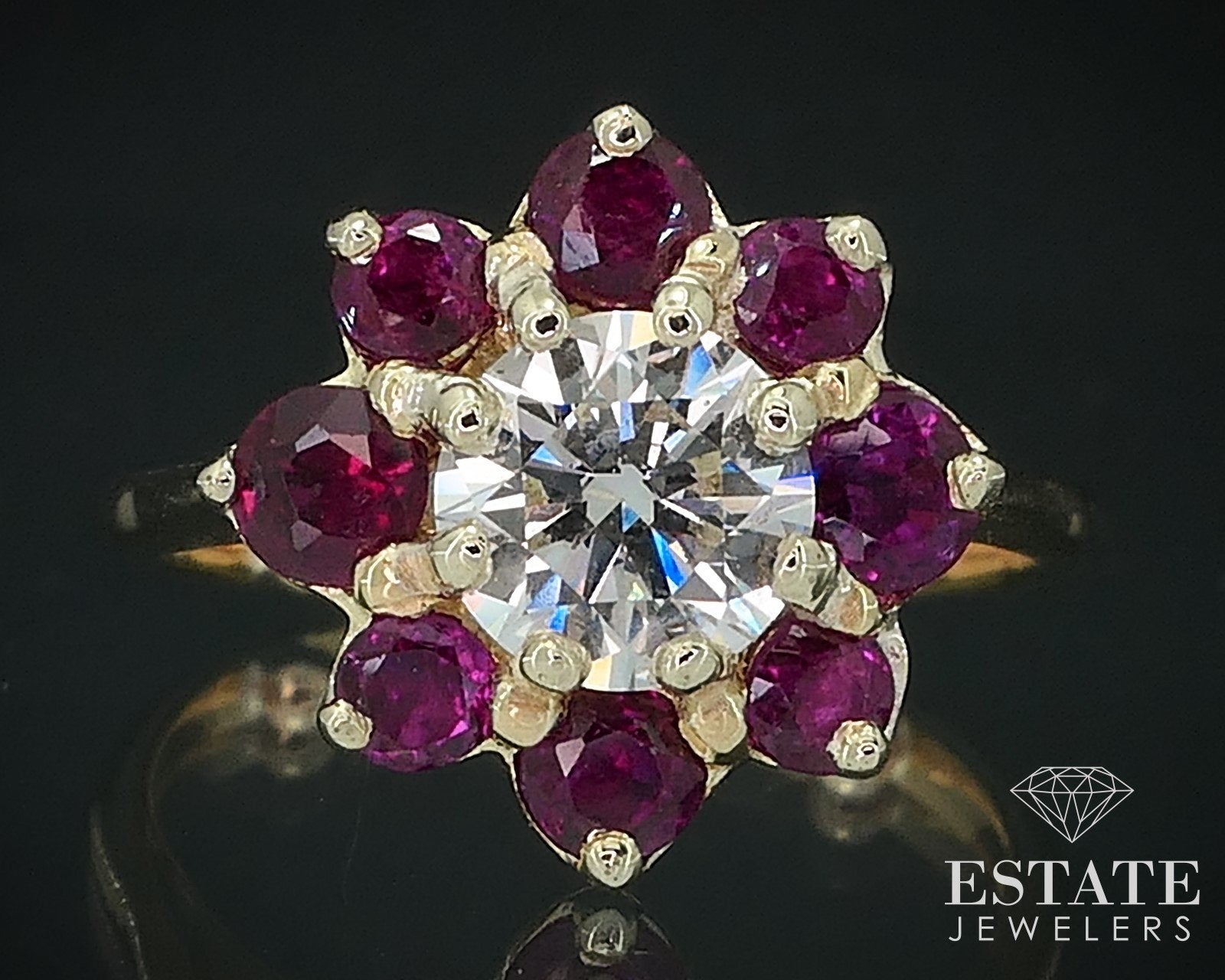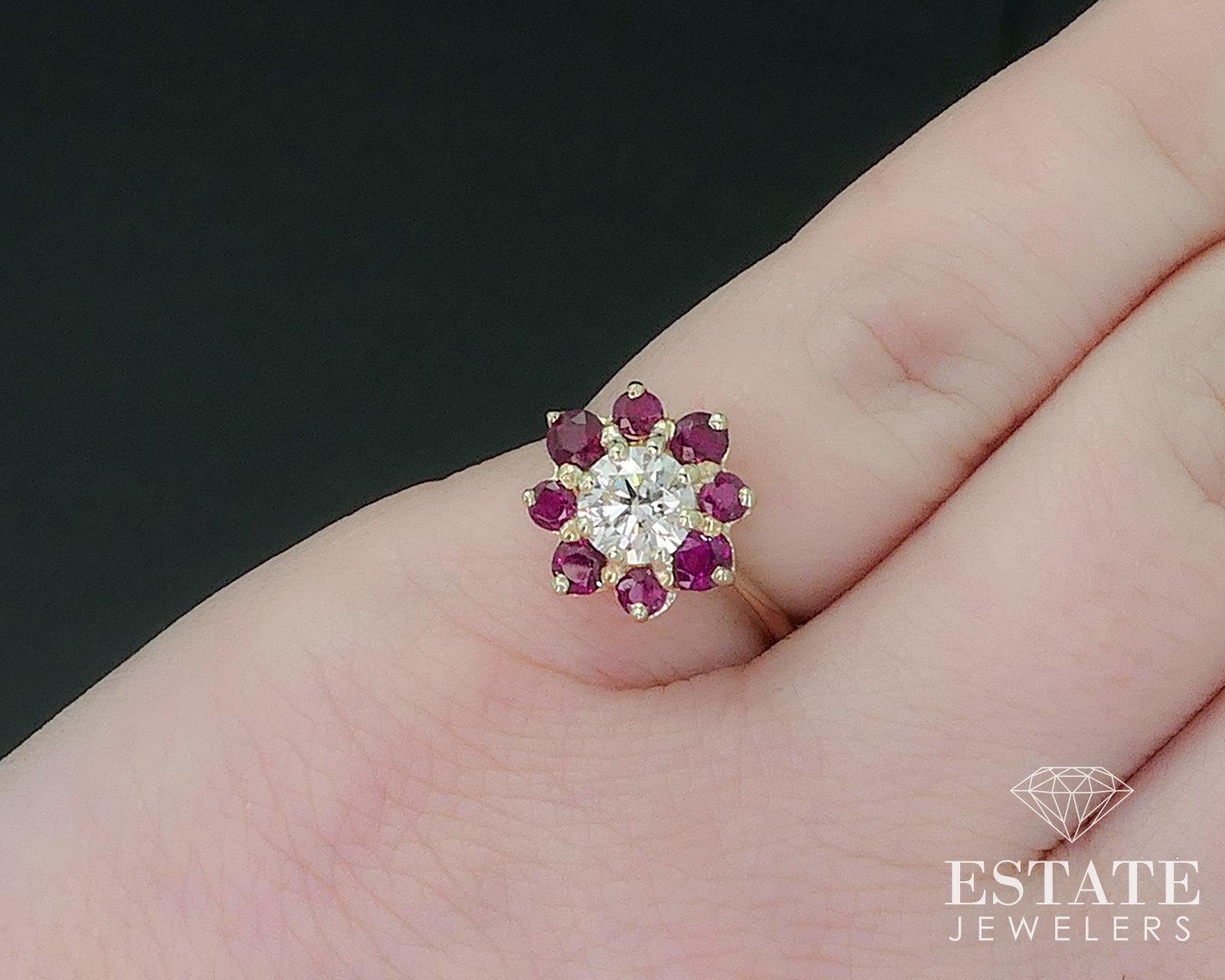 Lovely flower style ladies engagement ring with a sparkling approximate .60ct main round cut Diamond surrounded by Rubies. VS clarity with F color to the Diamond! 10mm tall face. Tested 18k SIZE-3, could fit bigger finger with sizing balls removed.
