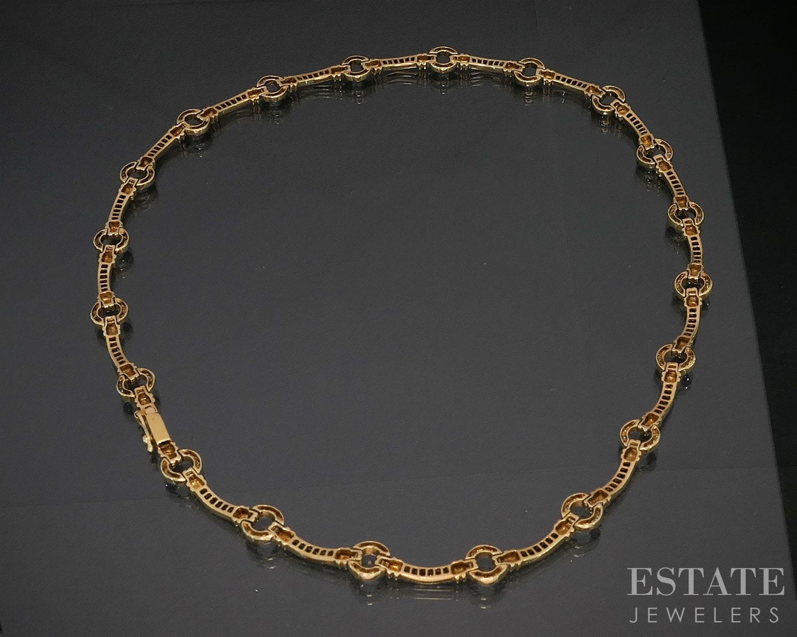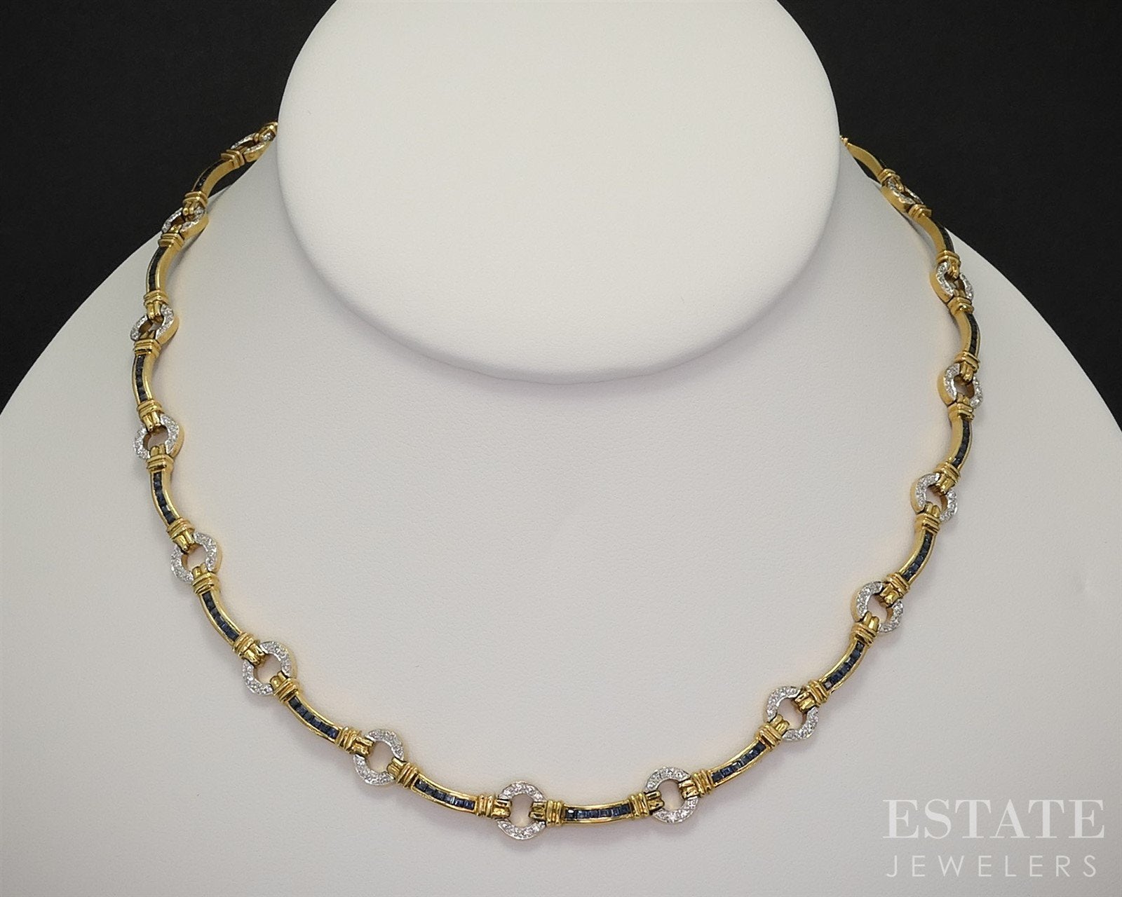 Additional Info: A bold fusion of classic elegance and modern design, this exquisite choker necklace is crafted in radiant 18k yellow gold. Featuring a striking link-style silhouette, the piece is adorned with richly hued Blue Sapphires, each meticulously set to catch the light with every movement. Interspersed between the sapphires are brilliant-cut Diamonds on circle links, adding a touch of timeless sparkle and luxurious contrast. The choker sits gracefully at the collarbone, offering a refined yet statement-making presence that transitions seamlessly from day to evening. Whether worn alone or layered, this necklace is a stunning celebration of sophistication and craftsmanship.