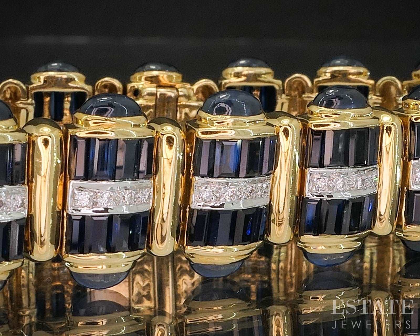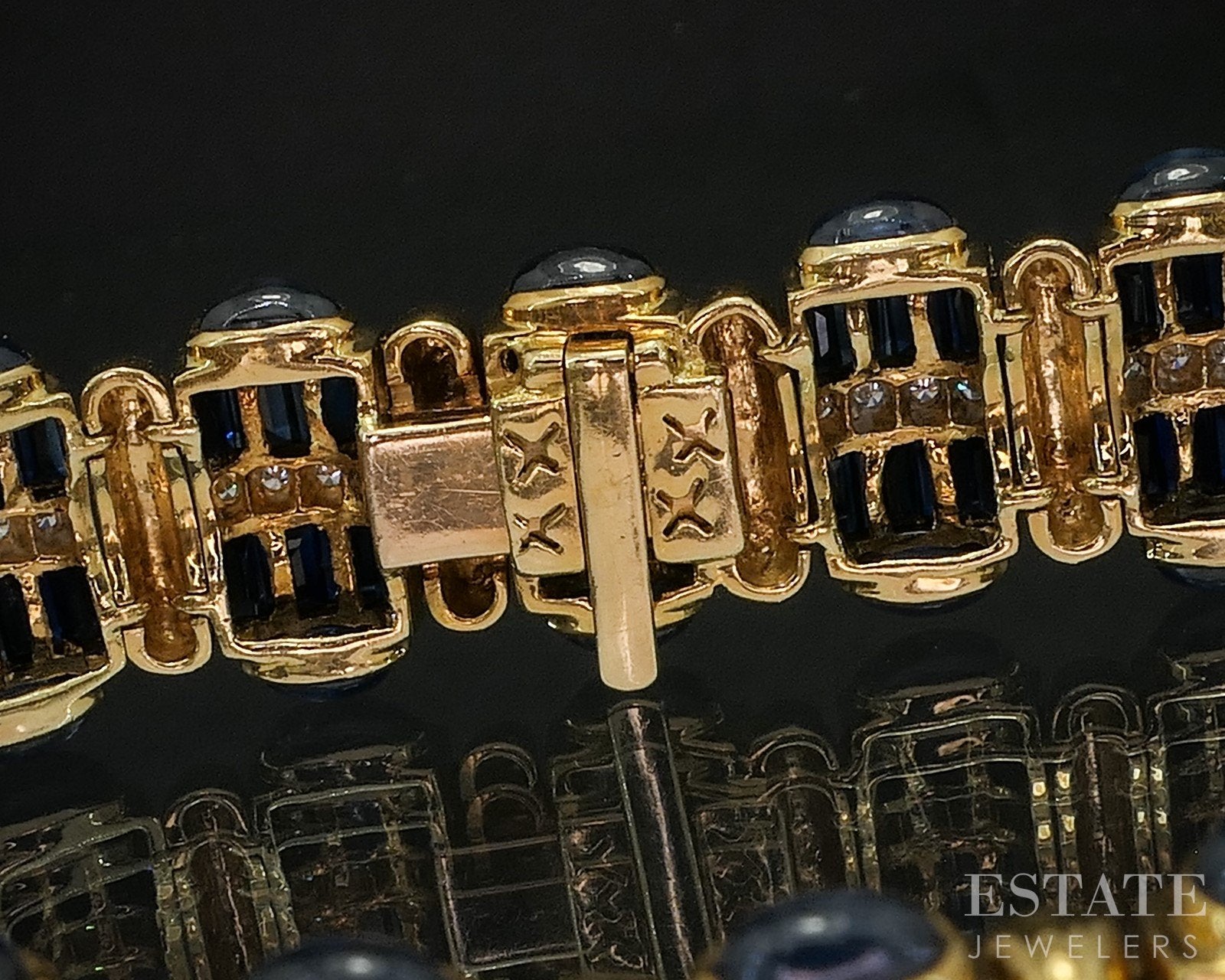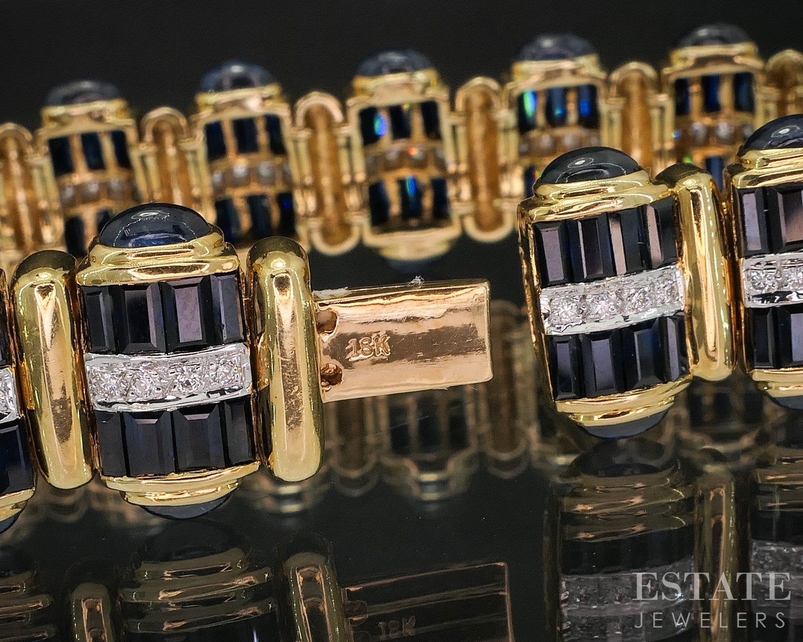 Additional Info: This luxurious 18k yellow gold bracelet showcases a stunning interplay of cabochon and baguette-cut Blue Sapphires, accented by brilliant white Diamonds. The smooth, rounded cabochons highlight the sapphires’ rich, velvety hues, while the sleek baguette cuts add geometric contrast and refined sparkle. Diamond accents illuminate the design, enhancing its depth and elegance. Expertly crafted with fluid gold links that move gracefully along the wrist, this bracelet is a masterpiece of color, texture, and light — a timeless statement of sophistication and artistry.