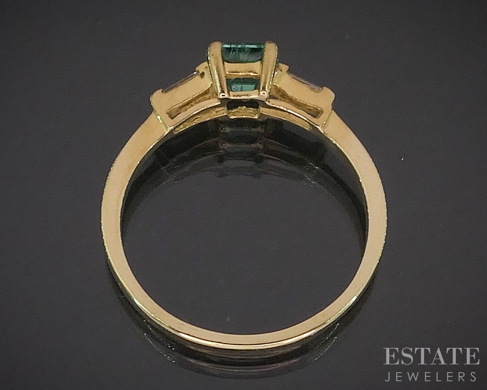 Additional Info: Sparkling ladies three stone ring with a vivid Emerald prong set in the middle and baguette cut Diamonds besides it.
