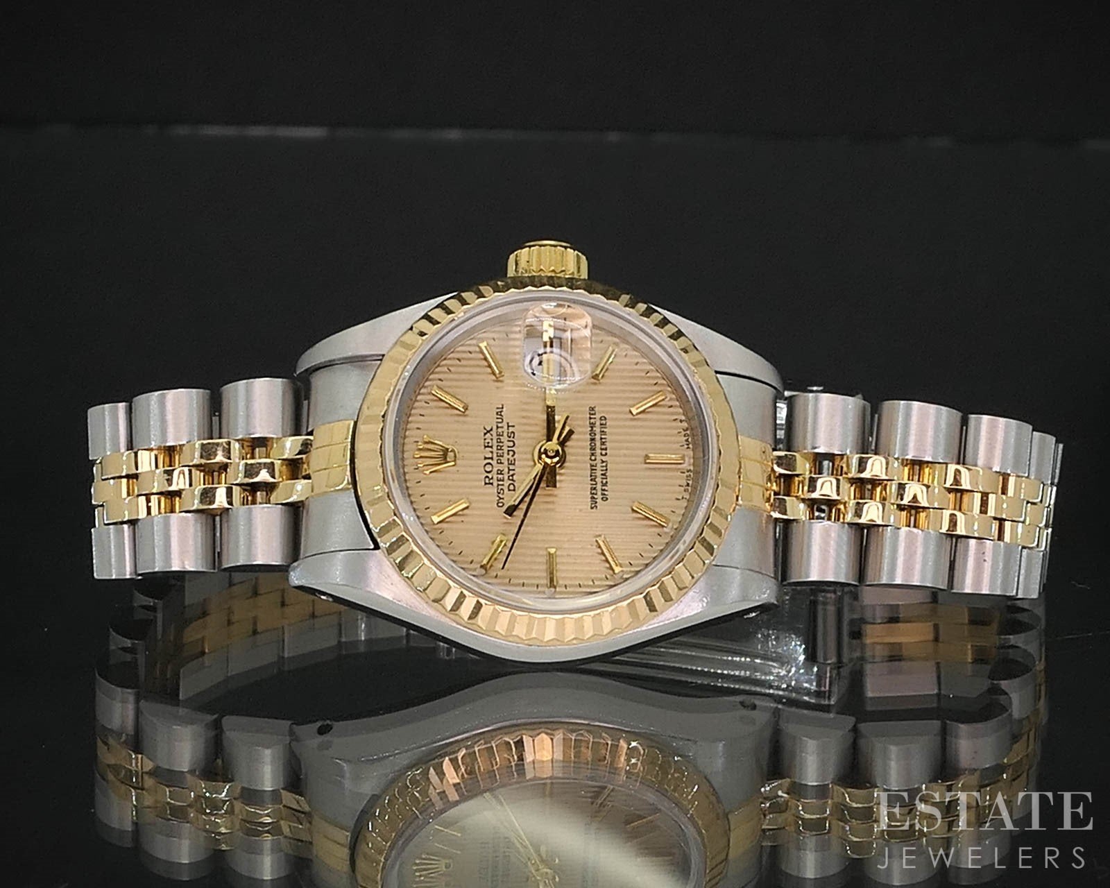 Additional Info: Luxury ladies wristwatch from Rolex. This Datejust model comes with a two tone stainless case and jubilee bracelet. Clean champagne tapestry dial accented by the classic fluted bezel. The serial number dates it to 1989 and the watch was just serviced. It comes with a 1-year warranty from 7/01/25