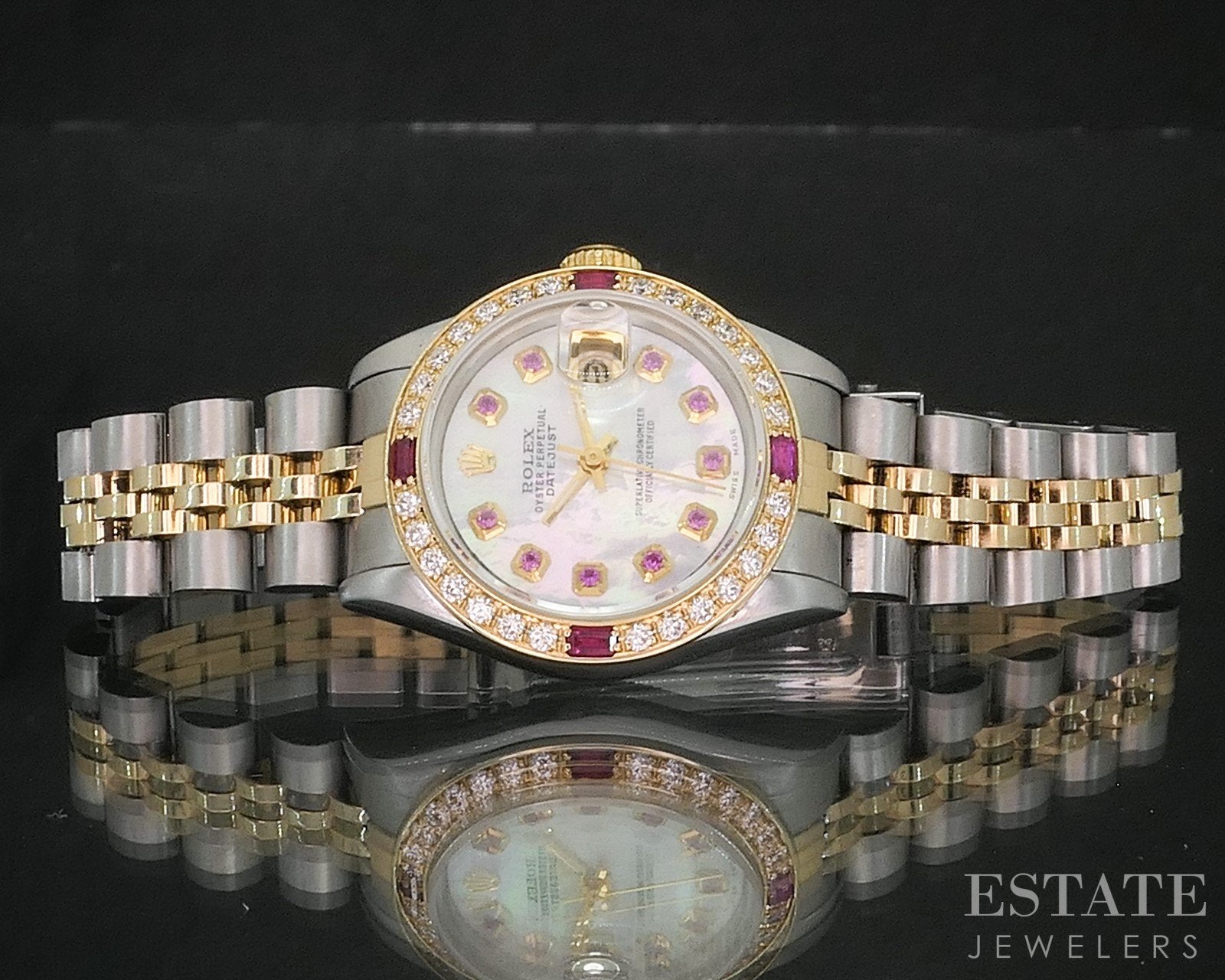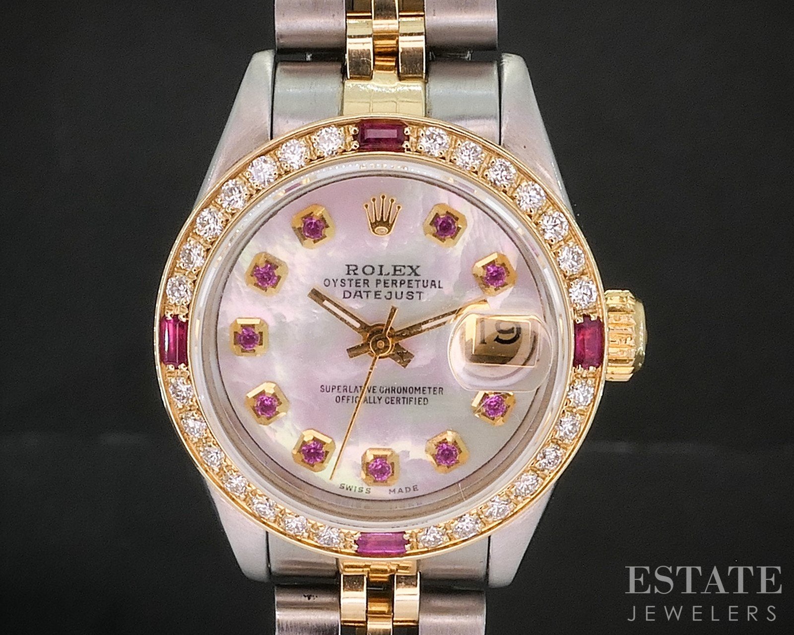 Additional Info: Luxury ladies wristwatch from Rolex. This Datejust model comes with a two tone stainless case and jubilee bracelet. Beautiful custom pink Mother of Pearl dial with ruby markers and a matching custom Ruby & Diamond bezel. The serial number dates it to 1995. Watch winds up and runs great.