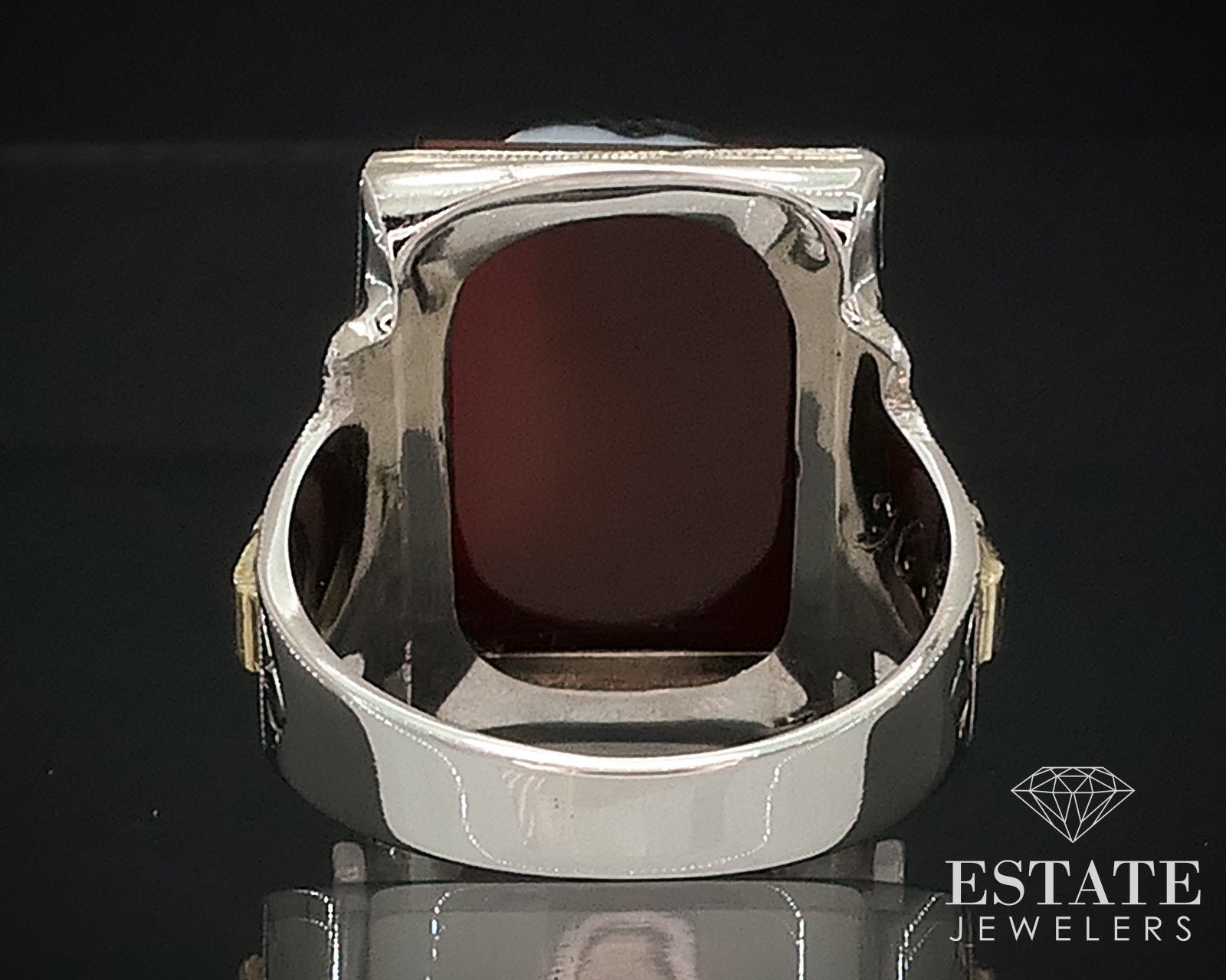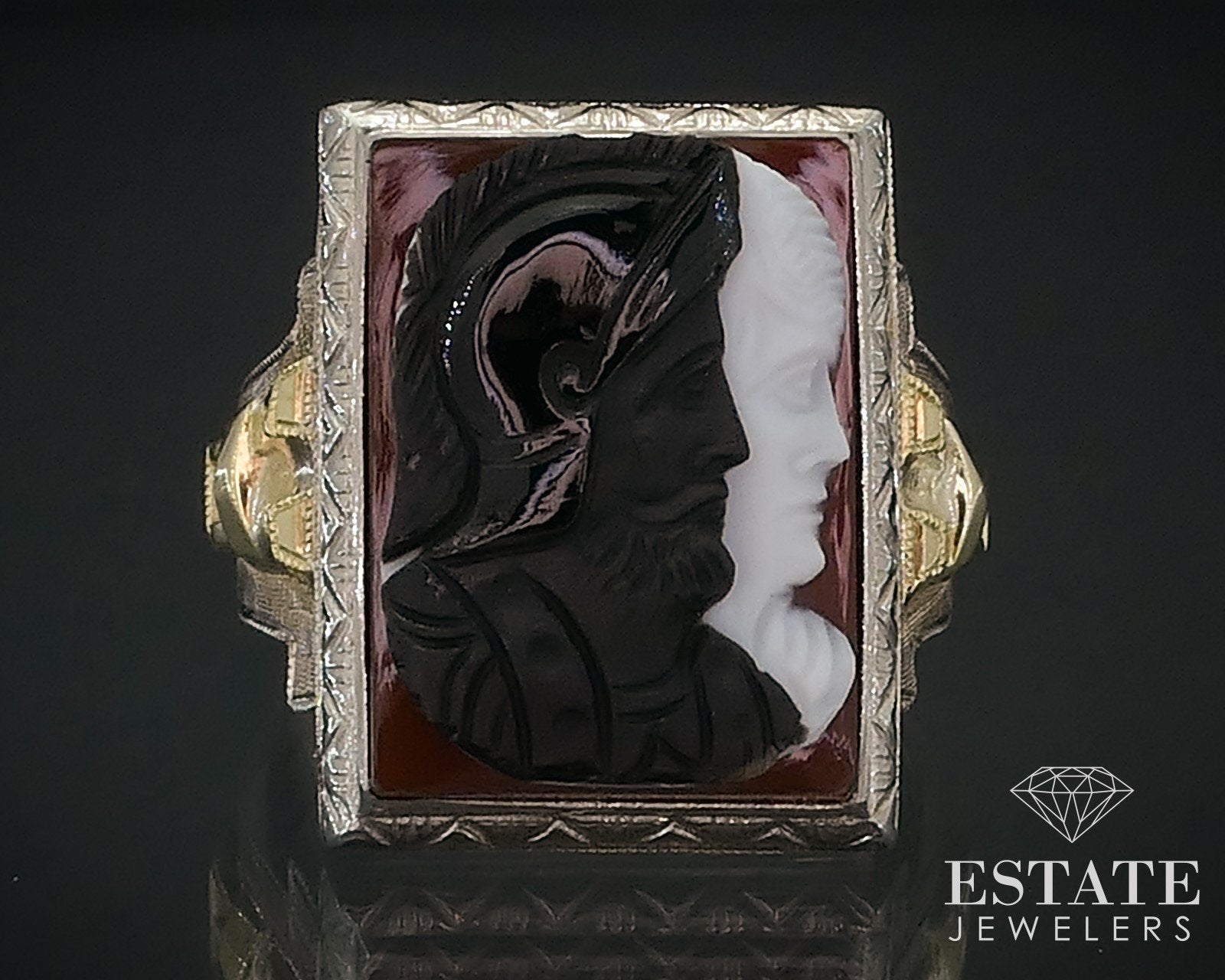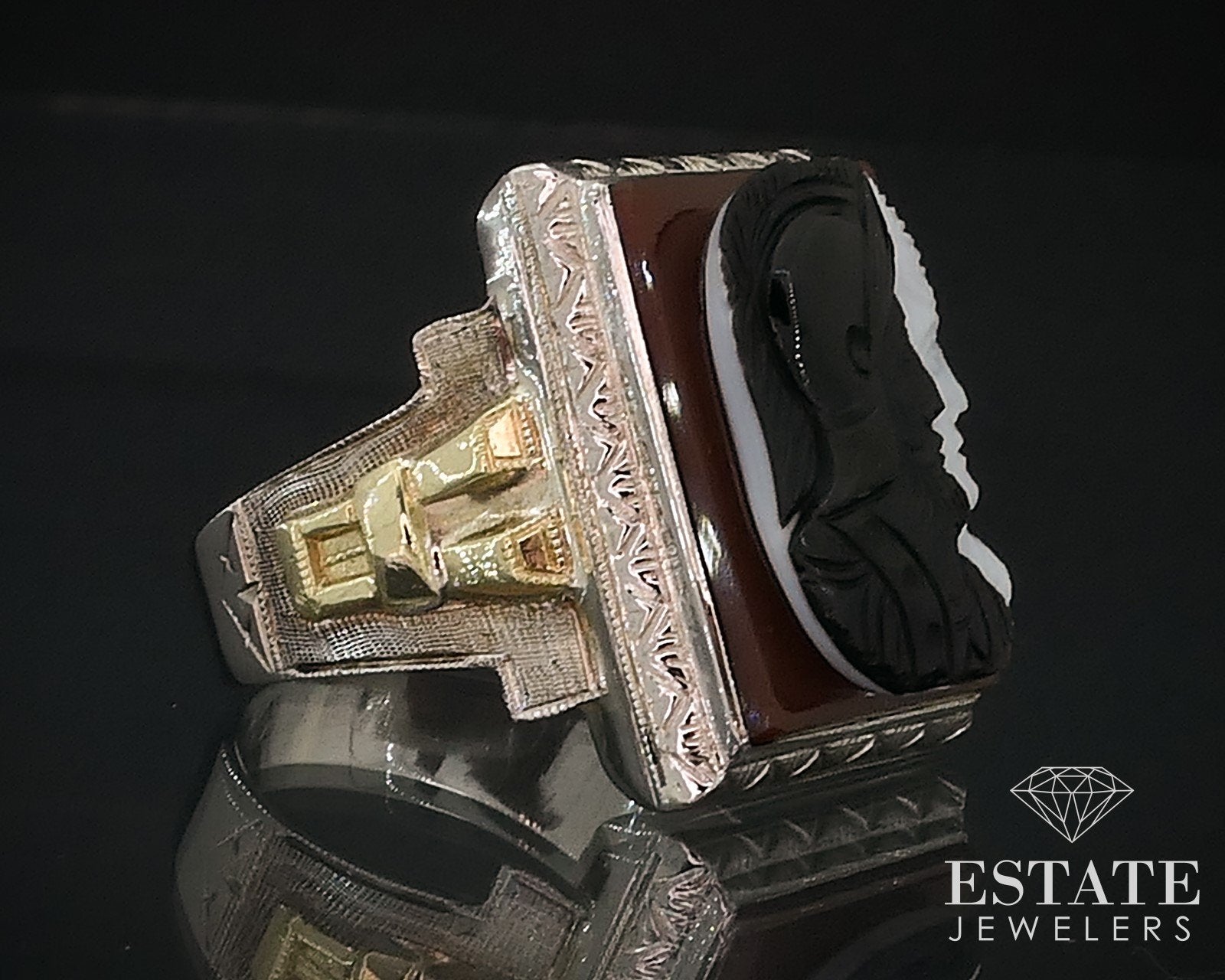 Handsome Victorian era ring of a large white gold men's band with hand engraving and yellow gold accents. 18mm by 14mm natural Sardonyx double cameo with a ton of detail to it still, Stamped 10k SIZE-8.75