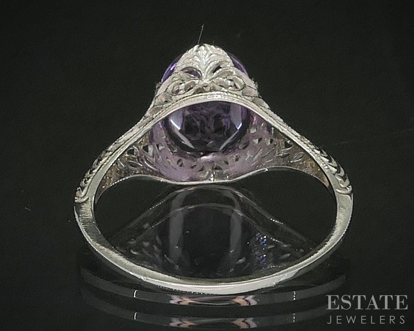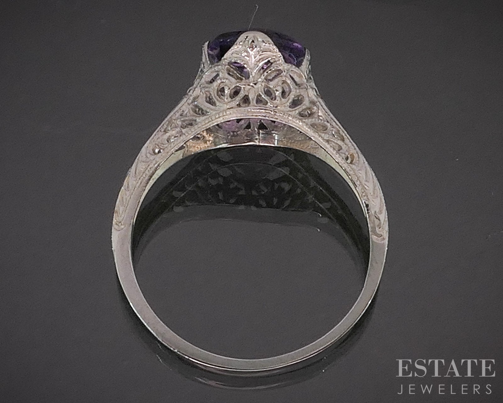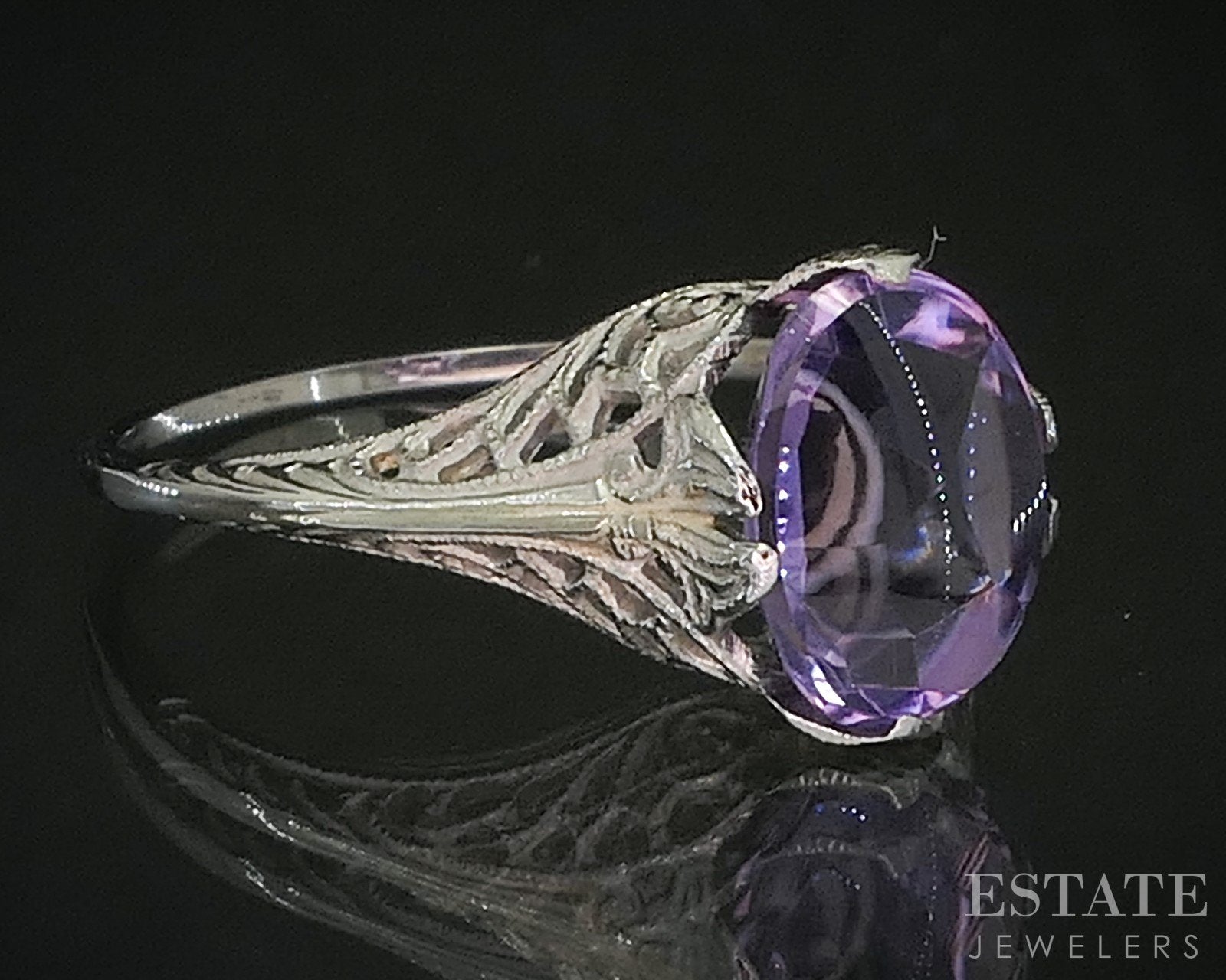 Additional Info: This enchanting ring is crafted in white gold and showcases intricate filigree work that reflects the elegance of antique artistry. At its center rests a richly colored Amethyst, its deep violet hue beautifully framed by the bright glow of the gold. Delicate, airy details throughout the setting give the piece a graceful, handcrafted feel. Full of character and classic beauty, this ring is a captivating blend of color, craftsmanship, and antique design.
