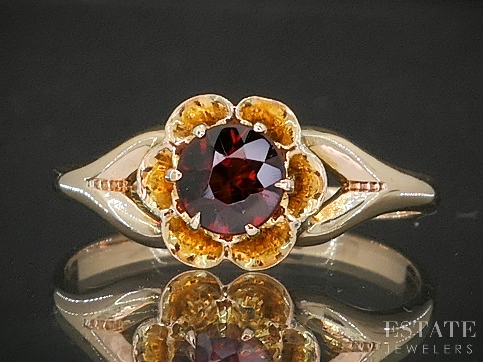 Additional Info: Beautiful early-century ring with a vivid Garnet prong set in a flower shaped head.