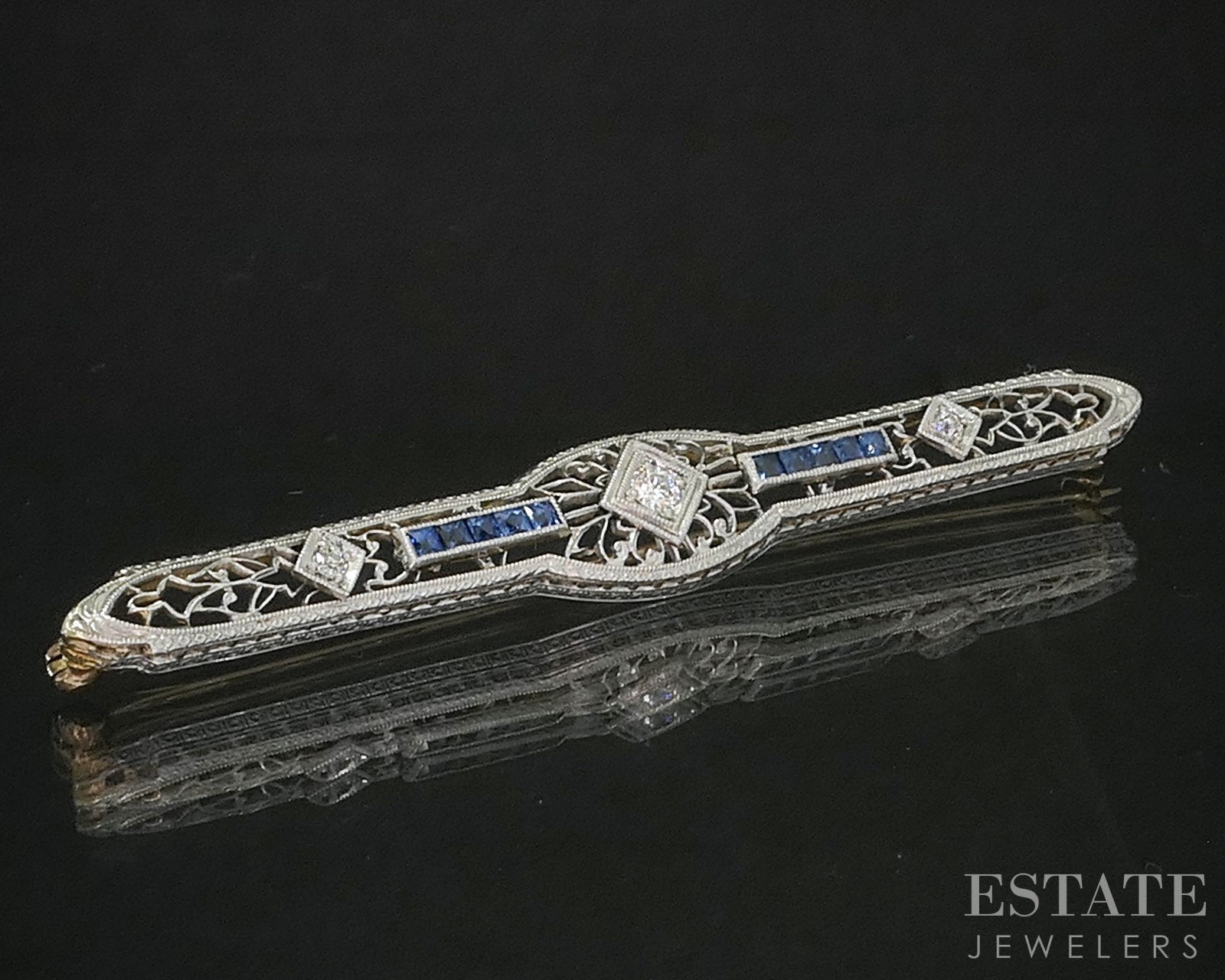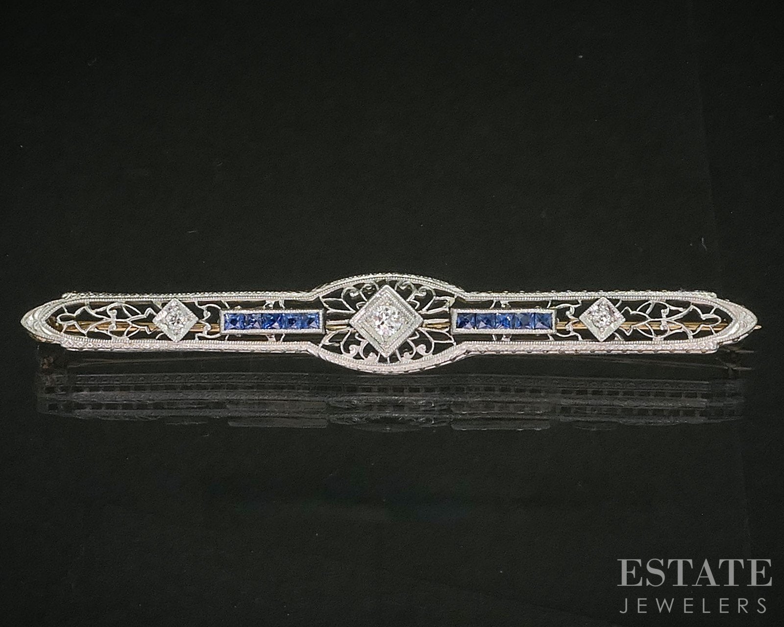 Antique 14k Two Tone Gold Diamond & Sapphire Filigree Bar Pin Brooch 5g p15402
