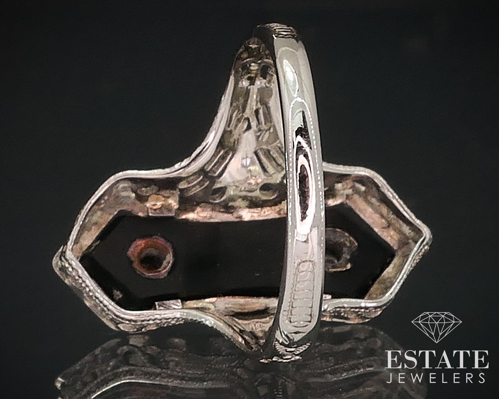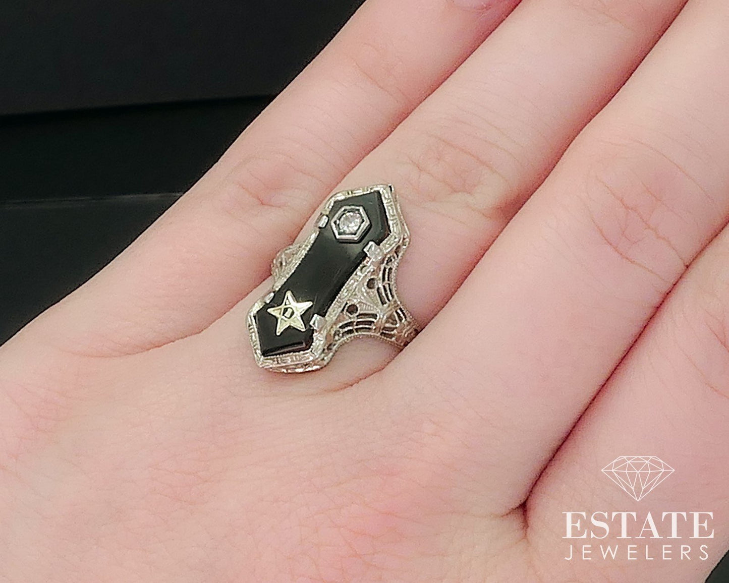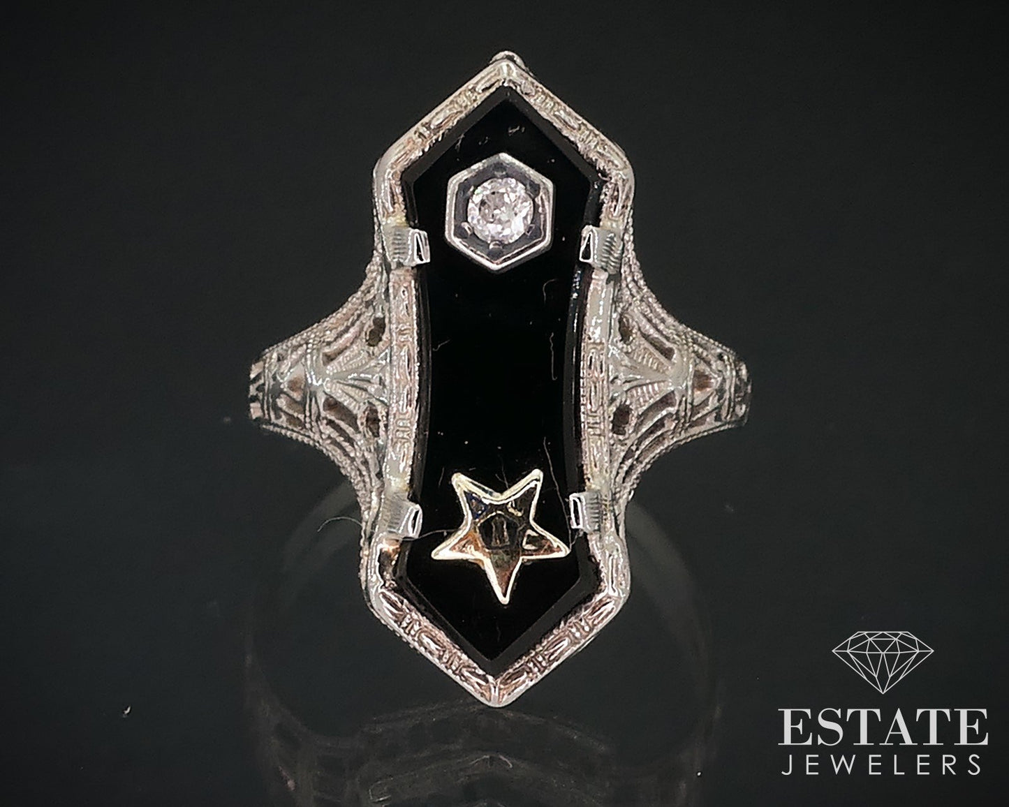 Antique 14k White Gold Masonic Eastern Star Diamond Black Onyx Ring 2.8g i17641