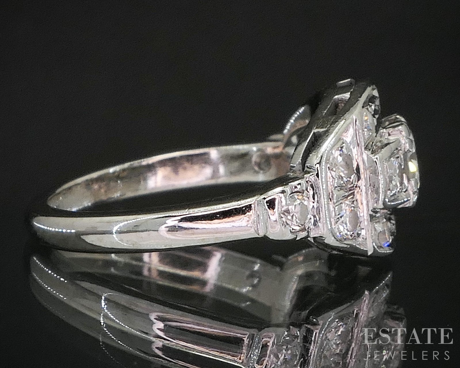 Additional Info: This antique 14k white gold Diamond engagement ring embodies the timeless elegance of early to mid 20th-century design. The ring features a central Diamond framed by a delicate arrangement of full and single-cut accent stones, each meticulously set to enhance the ring’s soft shimmer and vintage charm. Intricate detailing adorn the mount, showcasing the fine craftsmanship characteristic of the era. Romantic and refined, this ring captures the enduring beauty of antique jewelry — a graceful symbol of love with a touch of old-world sophistication.