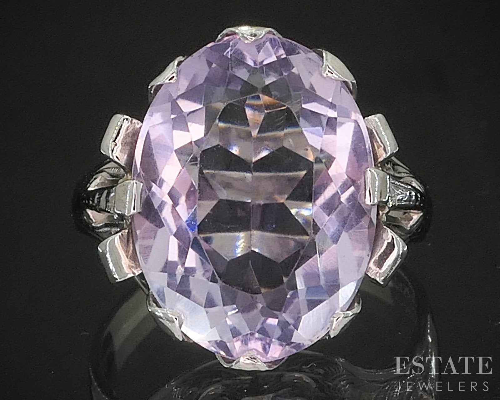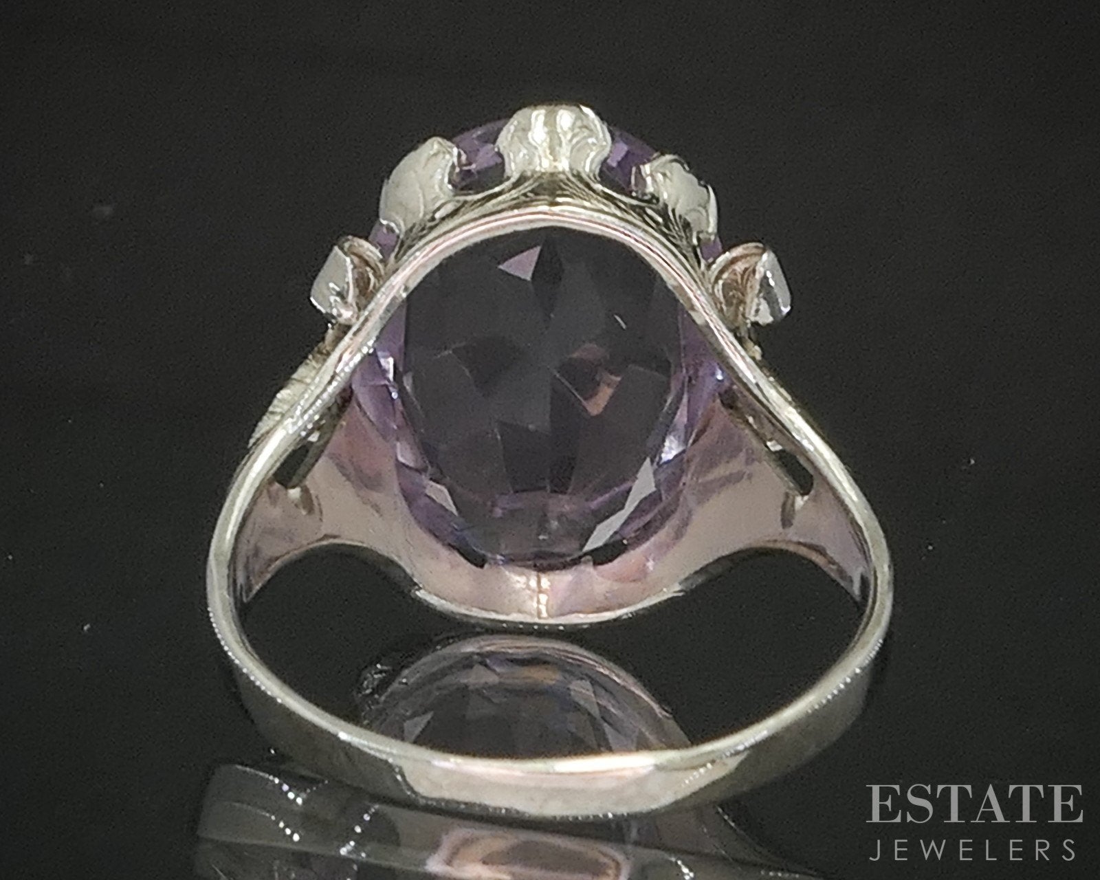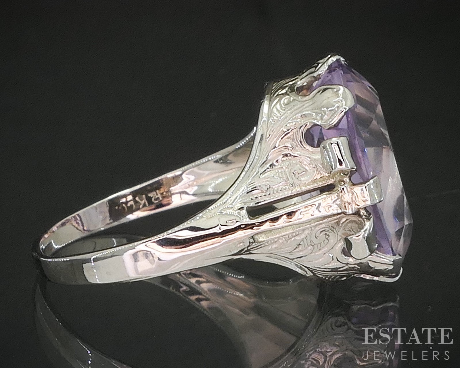 Additional Info: This enchanting ring is crafted in 14K white gold and showcases intricate filigree work that reflects the elegance of antique artistry. At its center rests a richly colored Amethyst, its deep violet hue beautifully framed by the bright glow of the gold. Delicate, airy details throughout the setting give the piece a graceful, handcrafted feel. Full of character and classic beauty, this ring is a captivating blend of color, craftsmanship, and antique design.