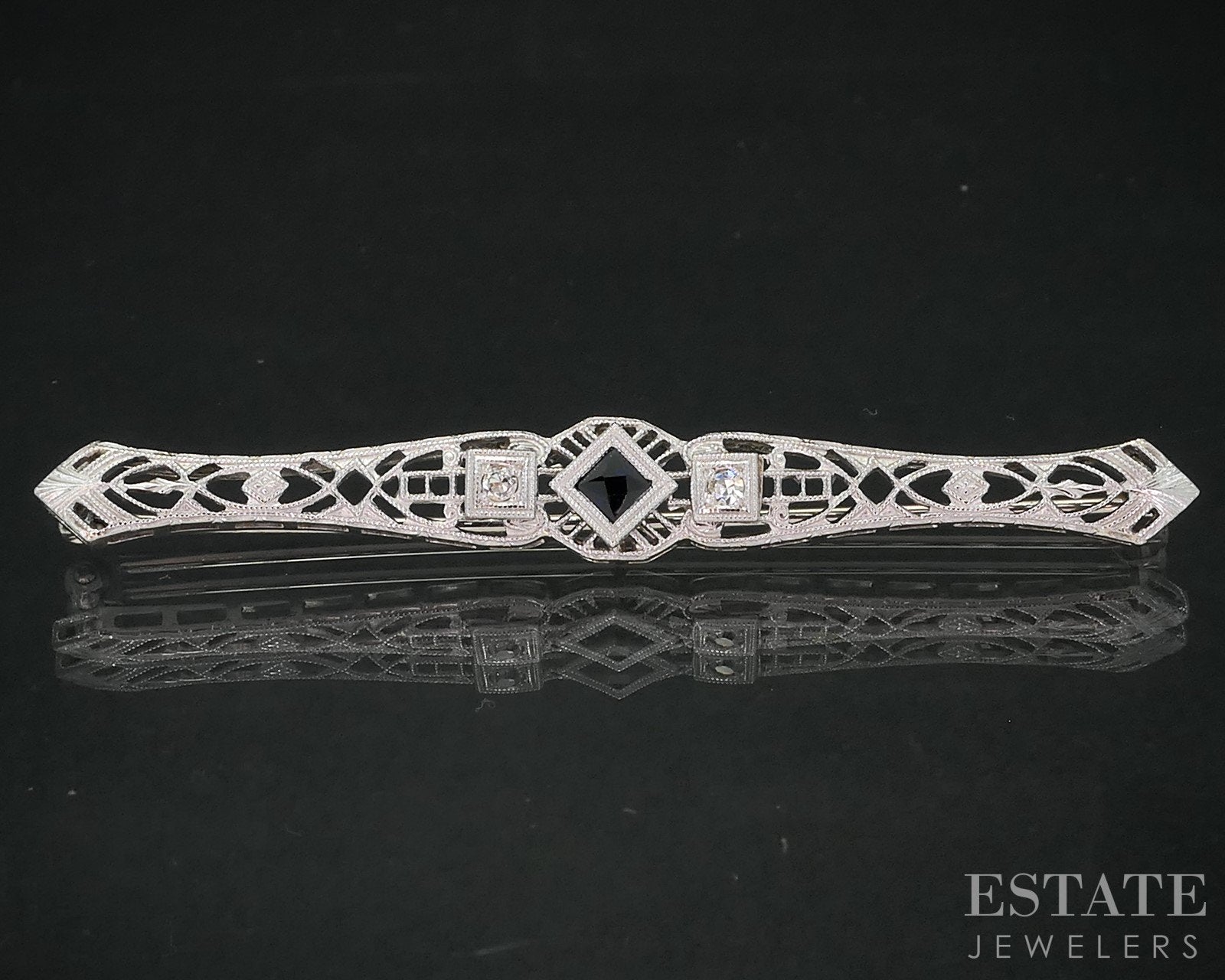 Antique 14k White Gold Sapphire & Diamond Filigree Bar Pin Brooch 3.4g i19154