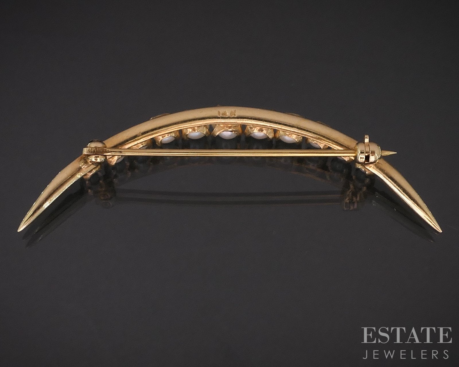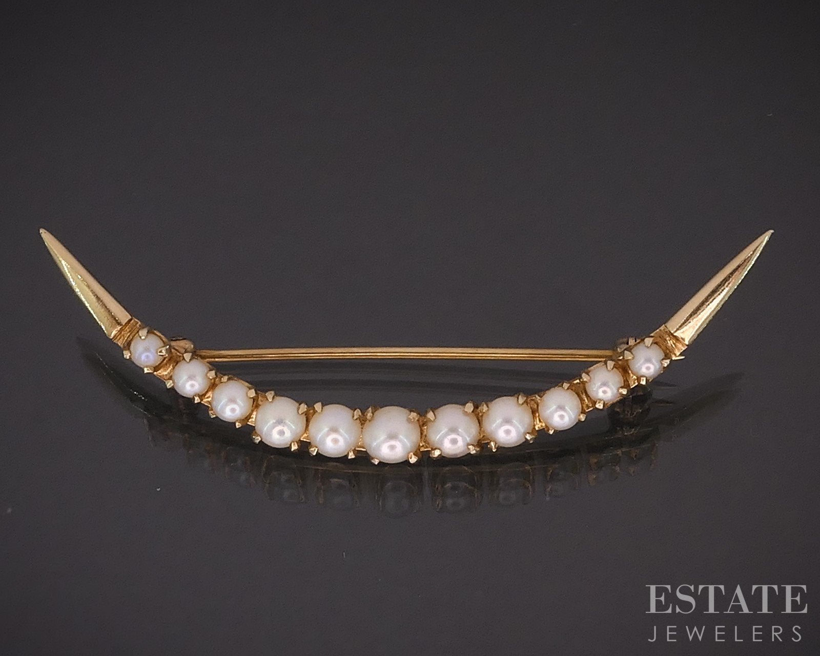 Additional Info: Beautiful crescent moon shaped brooch from the early to mid 1900's! Creamy matching graduated Pearls throughout.