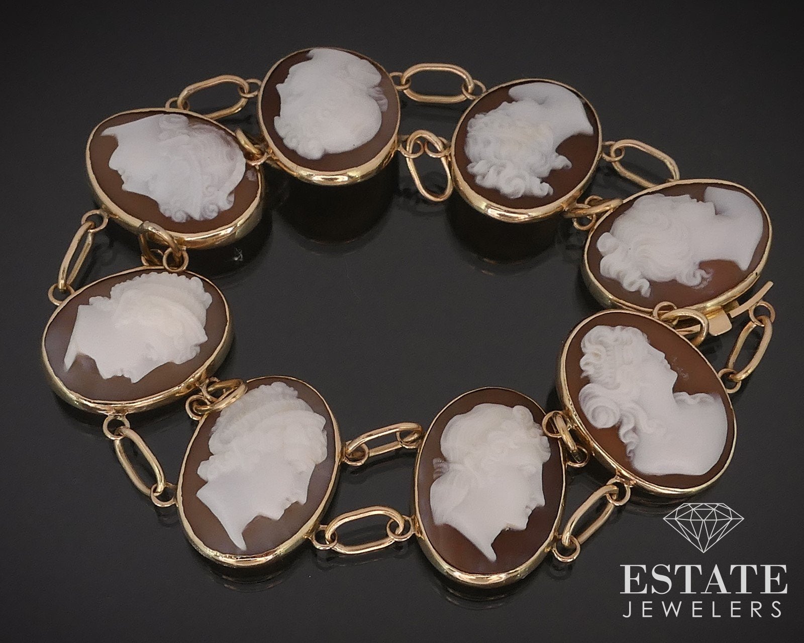 Lovely early to mid 1900s gold link bracelet with natural carved cameos on each link. Multiple styles of portraits and in incredible condition for its age! Measure 7.25"L. stamped 14k