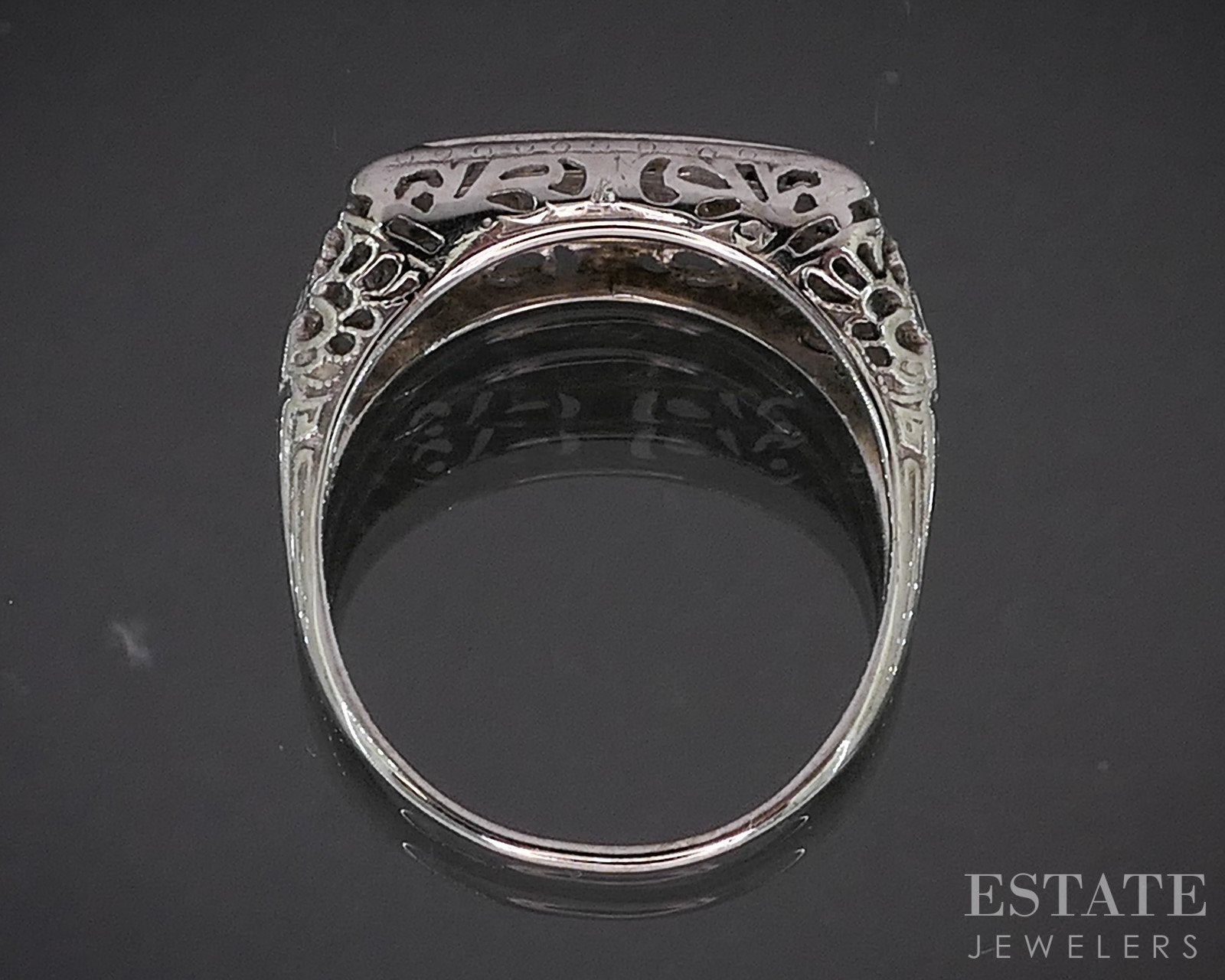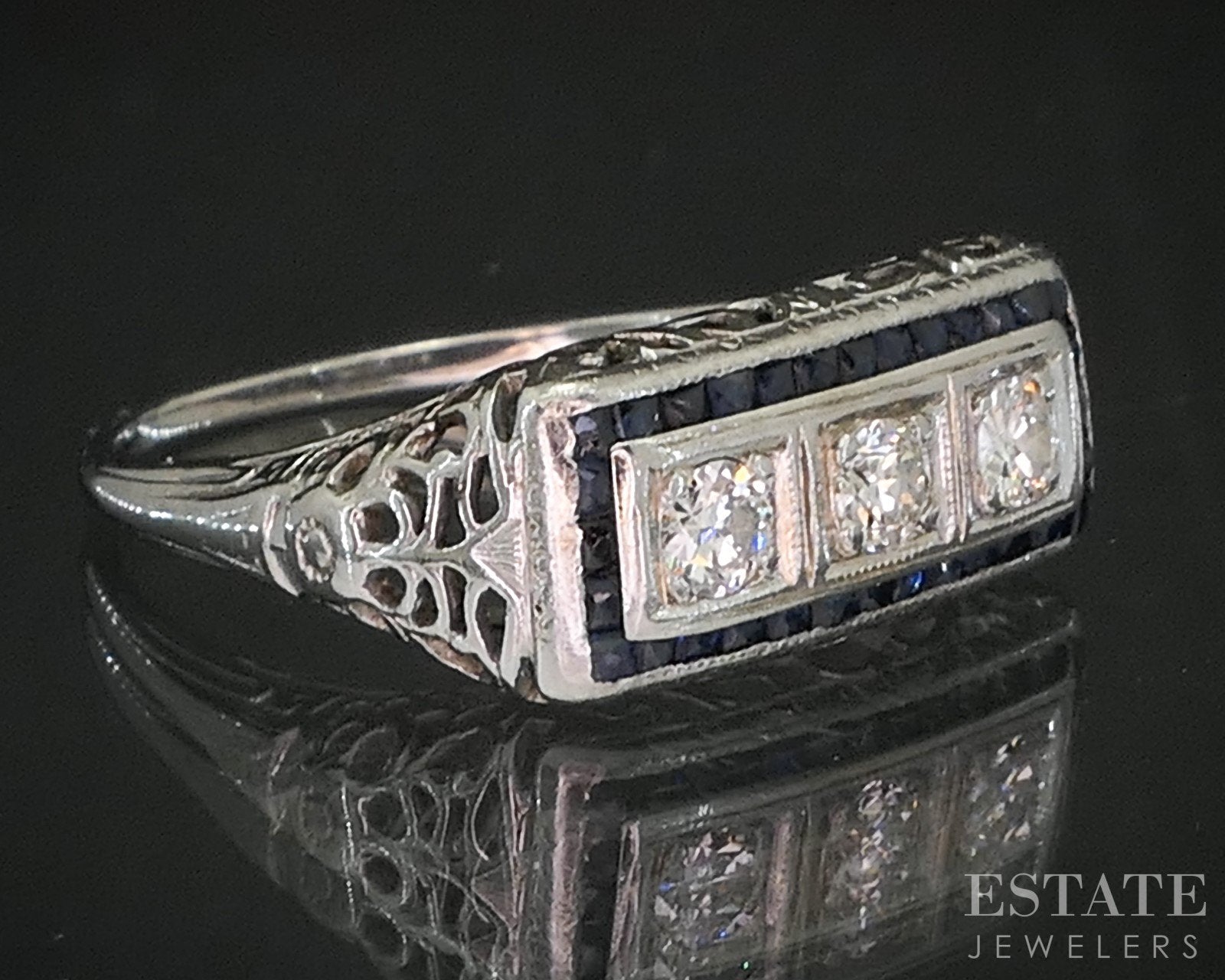 Additional Info: Handcrafted in luminous white gold, the ring features three sparkling Diamonds. Framing the center stones are richly hued French cut Sapphire accents, precisely set in angular, symmetrical patterns that echo the bold geometry of the mid-century. Intricate filigree details complete the design, adding texture and timeless charm. A perfect choice for those who cherish antique beauty and enduring craftsmanship.
