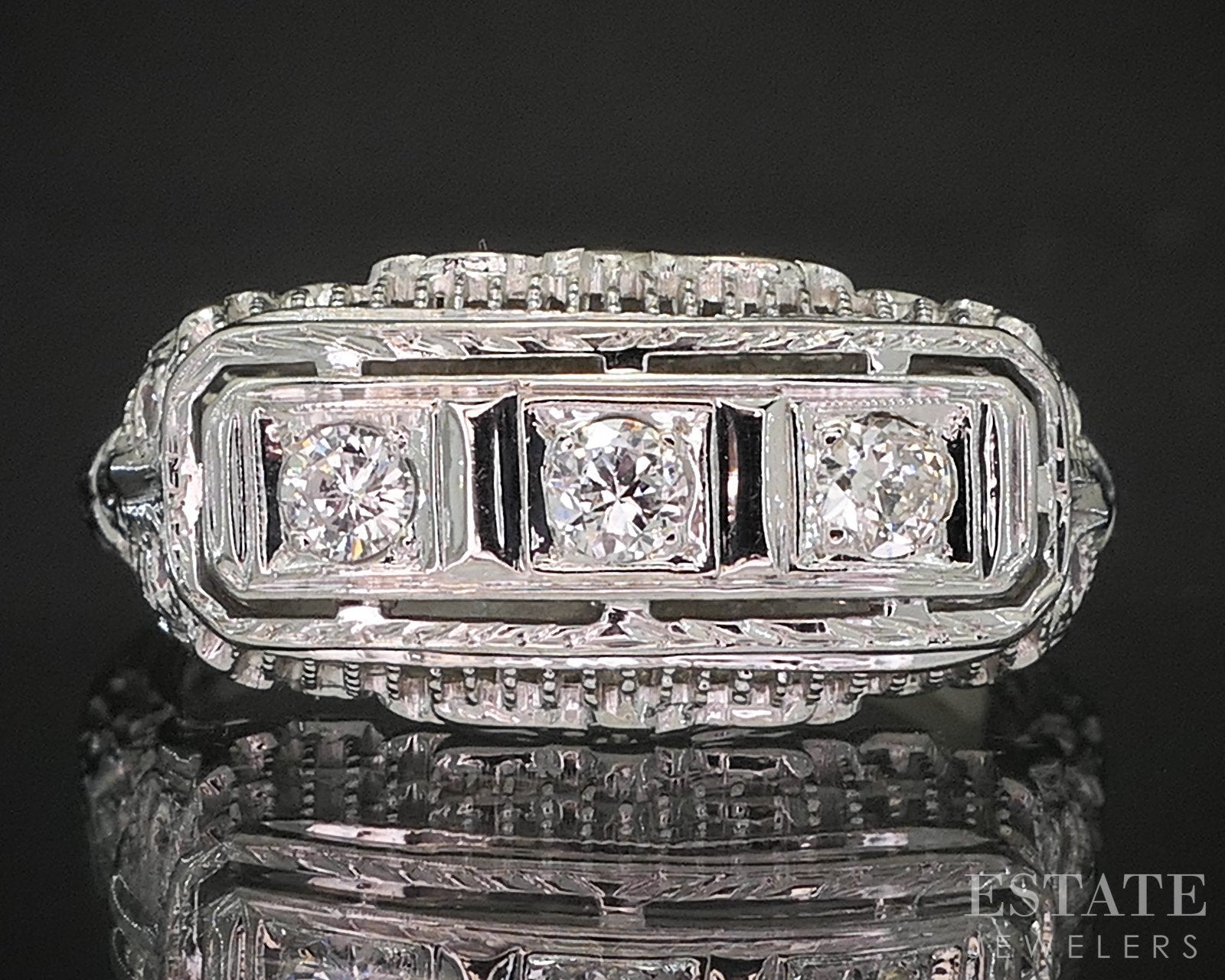 Additional Info: Sparkling early 1930's engagement ring with three round cut Diamonds set in the middle. Beautiful engraving and open filigree designs you would normally see from engagement rings that originated back then!
