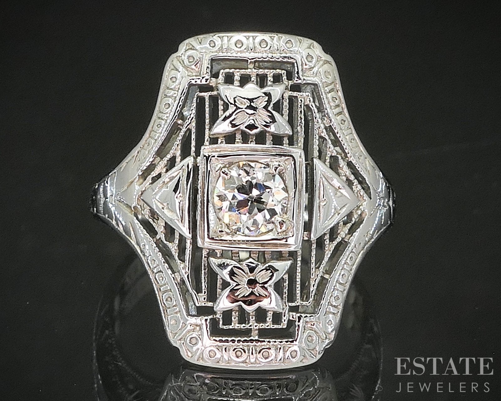Additional Info: Sparkling early 1930's engagement ring with a Old European Cut Diamond set in the middle. Beautiful engraving and open filigree designs you would normally see from engagement rings that originated back then!
