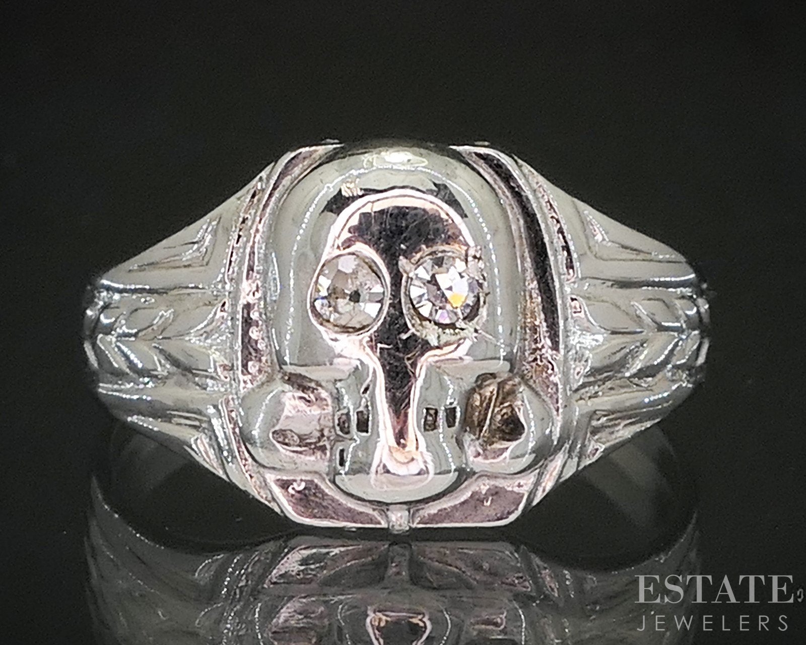 Antique 18k White Gold & Sterling Natural Diamond Skull Signet Ring 2.9g i20470