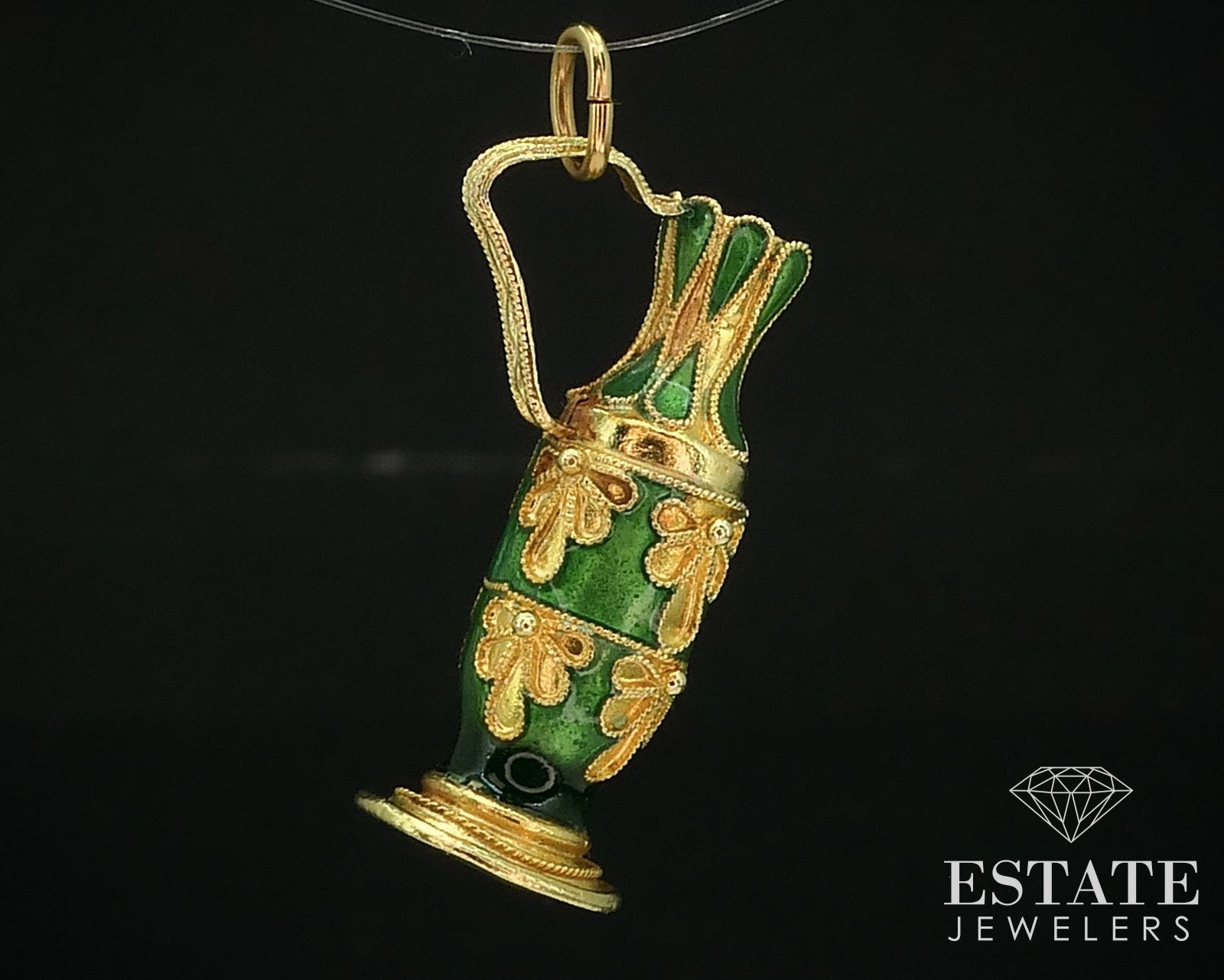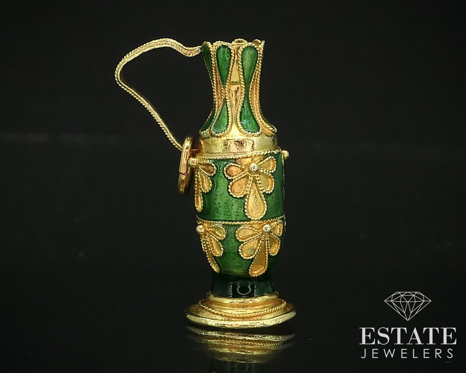 Stunning mid to early 1900's water pitcher shaped charm with lovely green enameled designs. Measures 1-1/8" long including bale. tested 18k.