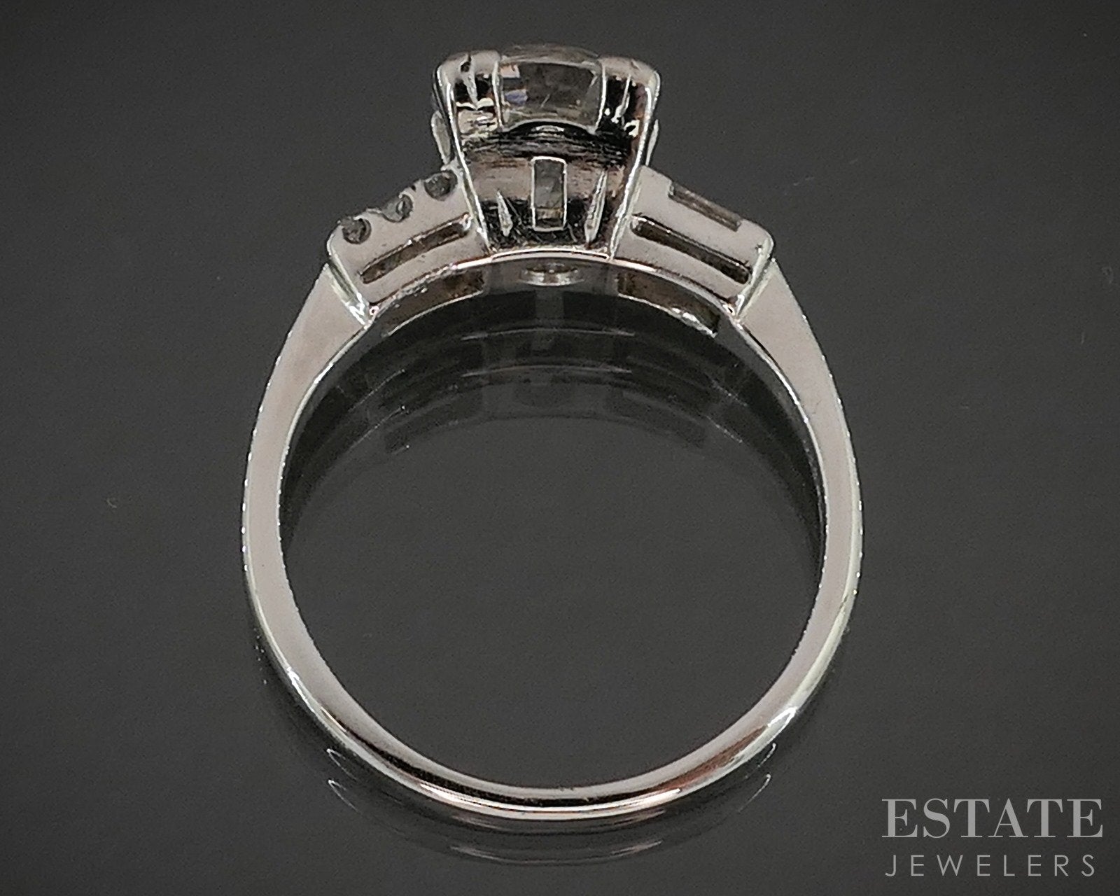 Diamond Information: Approximate 1.60ct old European cut Diamond with single and baguette cut accents. I1 clarity with KL color to it. 7.4mm stone