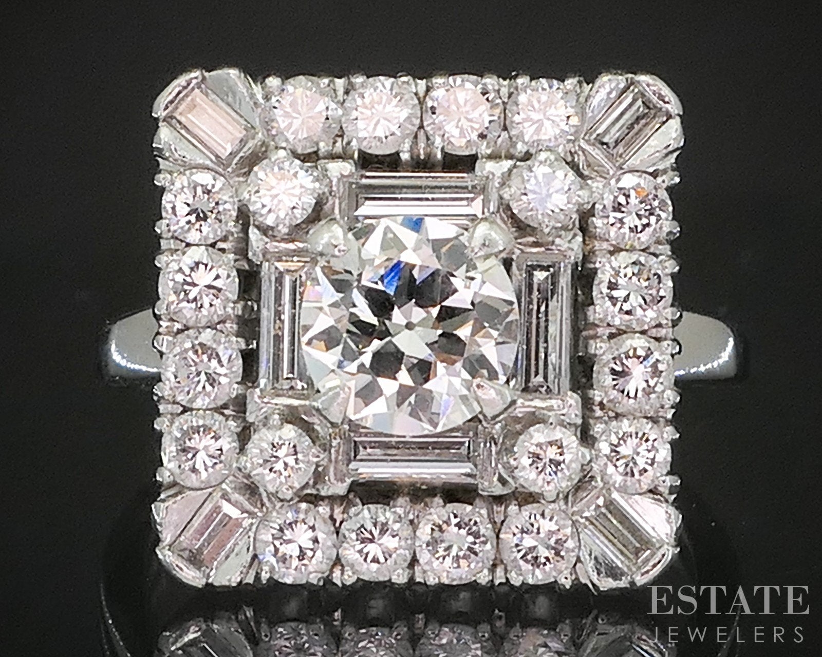 Additional Info: A striking example of Art Deco elegance, this antique cocktail ring is expertly crafted in sleek platinum and defined by a bold square silhouette. At its center sits a captivating old European cut Diamond, prized for its soft, romantic brilliance and hand-cut character. The geometric design reflects the era’s love of symmetry and architectural form, while the cool platinum setting enhances the Diamond’s luminous sparkle. Sophisticated and dramatic, this Art Deco ring is a timeless statement piece that embodies the glamour and refinement of early 20th-century design.