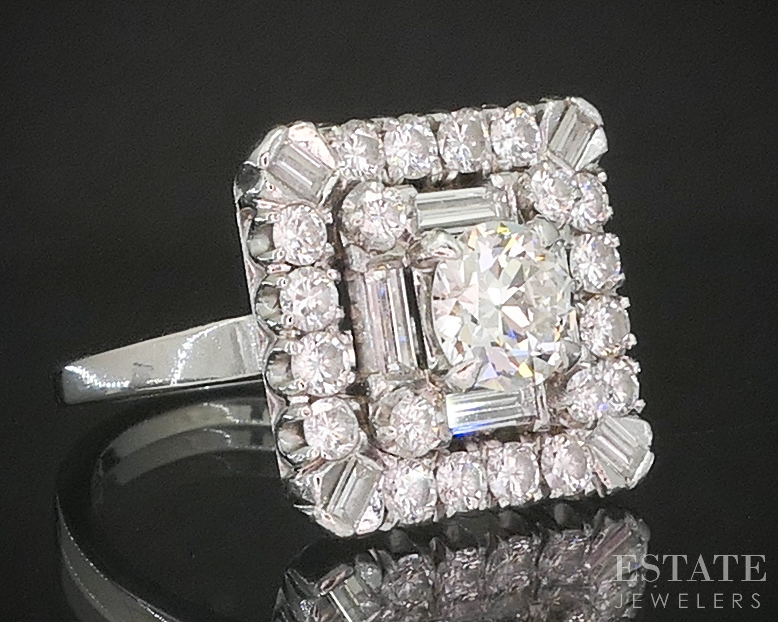 Diamond Information: Approximately 1.30ctw of round, baguette and old European cut Diamonds. That including the main .60ct old European cut Diamond. VS clarity with JK color to it.